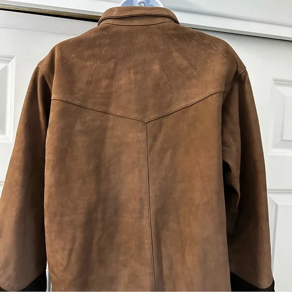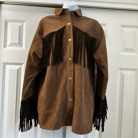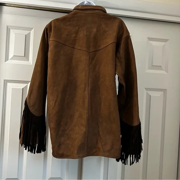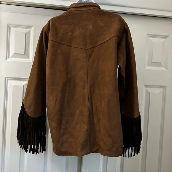 So cool in suede, this effortless bomber jacket is featured in a classic, slouchy silhouette with button-front closure and exaggerated fringe detailing at back.Care/ImportDry Clean OnlyImport🔥 Brand new, with/without tags.May have been tried on in store, but in new /good condition.🔥LINE THRU TAG IS TO PREVENT STORE RETURN
