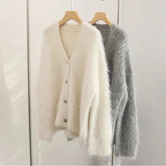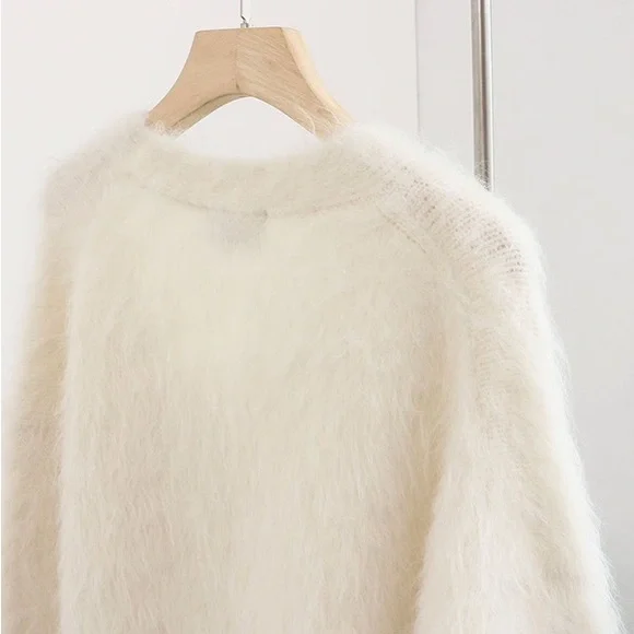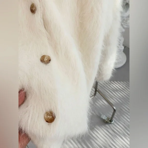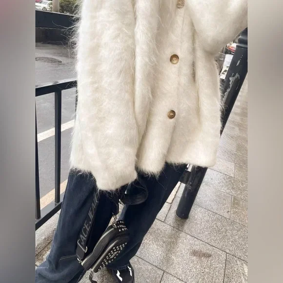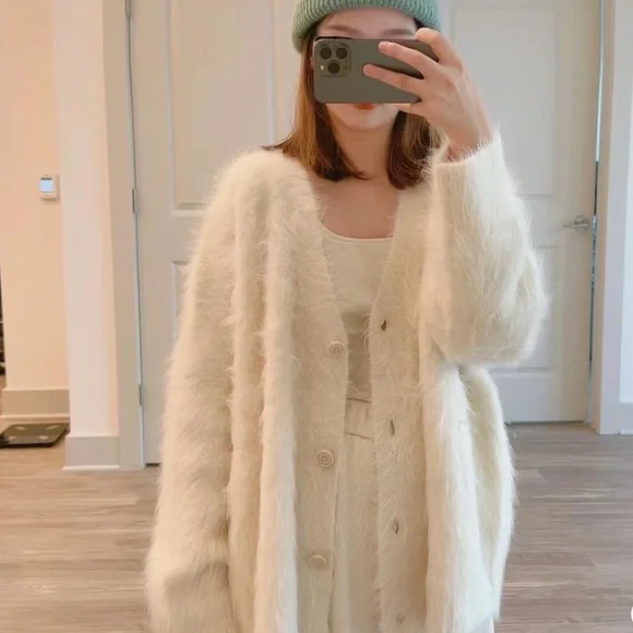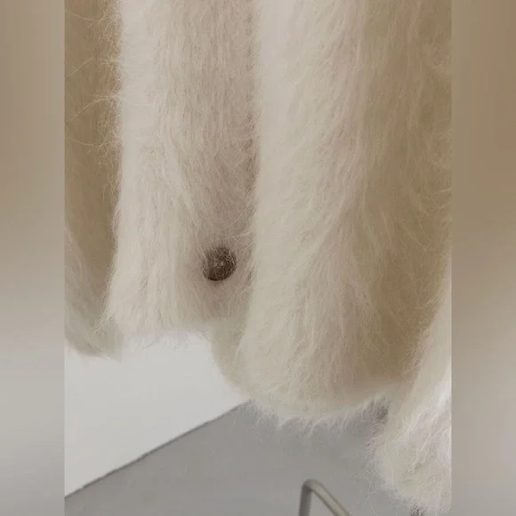 Oversized Textured Alpaca CardiganPreloved item, only worn 2-3 times. Great condition Color: whiteOne size Textured knit V neckline,button front Long sleeves Oversized fit cuffs and hem Material: Alpaca/polyamide/elastaneIt’s very similar to Toteme alpaca biella cardigan. Alpaca fur feels nice and extremely soft, but unavoidable shedding problem. Only purchase if you don’t mind.