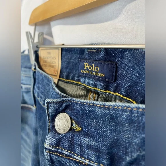 Men's Hampton Relaxed Straight JeansNew with tags! Low-rise belted waistEmbroidered "RL" at the coin pocketZip fly with a signature shank closureFive-pocket styling with signature metal rivets at the frontSits slightly below the natural waistSubtly tapered leg openingsRalph Lauren men's jeansB2