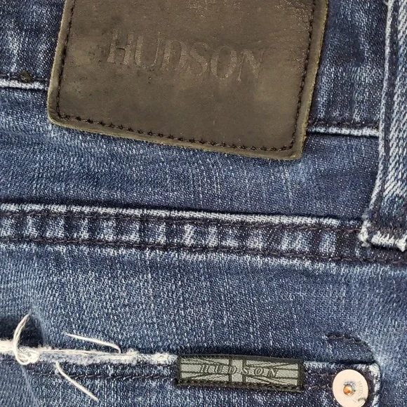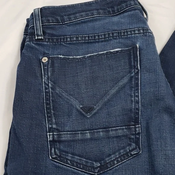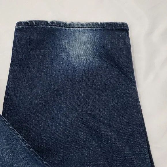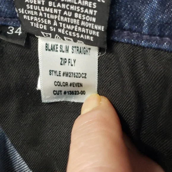 Can’t beat Blake, our modern, just-right fit. Mid-rise, slim through the hip and thigh with a tapered leg. A classic. The dark indigo Blue Shadow wash is cut from premium comfort stretch denim with ample destruction for character.There is a flaw, pictured. lighter area on the back of the right leg, near the bottom.These jeans have a slight stretch