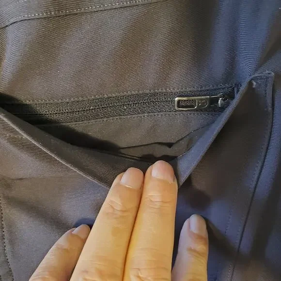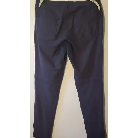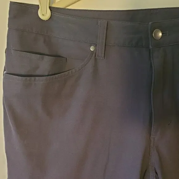 In excellent clean condition. The LULULEMON Men's Navy Gray Performance Stretch ABC 5-Pocket Pants in size 33 are solid gray in color and made of a polyester blend material. These pants feature a zip closure, flat front design, and a mid-rise fit with a straight leg style. They are machine washable and have a classic fit with a 5-pocket design, making them ideal for casual wear. The pants are designed for men with a regular size and have a 29.5-inch inseam, perfect for everyday comfort and style.
