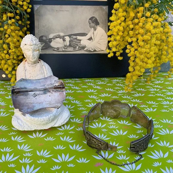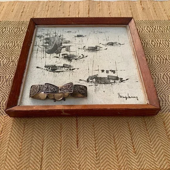 And so the story goes... Thebeautiful colonial silver jewelry was purchased with forethought by the Graham Greene-esque protagonist, to be gifted to his beloved upon his return to his home country.Only, they were mere tokens of apology for leaving again, having just arrived.He was inexorably drawn back to the rhythm of that mysterious realm, and to her people, where he would be lost to all but his true self.Repousse brooch possibly from Laos or Kingdom of Cambodia.Filigree repousse panel link bracelet from Viet Nam. Condition comensurate with age.No major flaw.