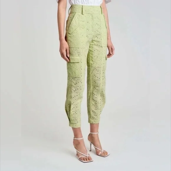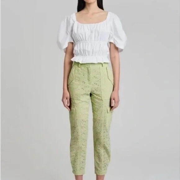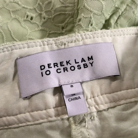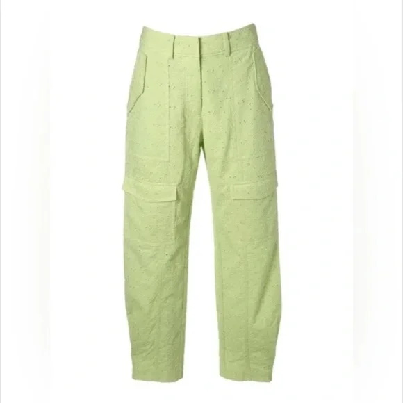 Derek Lam 10 Crosby Mila Floral Eyelet Utility Cropped Pants Green/Matcha/Light Green Size 8The Mila Utility Pant is a new interpretation of a Derek Lam 10 Crosby signature silhouette. Its soft cotton construction with all-over eyelet detailing adds a feminine touch to the utility style. It features cargo pockets on the front and side and patch pockets on the back. Fully lined. The high-rise waist and tapered legs add soft tailoring to the relaxed fit.MSRP $295.00NWOT - shelf pull, tags removed by store.Brand New without tags from reputable wholesaler.Please let me know if you need any measurements before purchase.