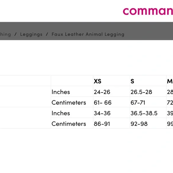 Designer/Brand: CommandoCondition: Excellent (new without tags, never used)Size: MediumDescription:Commando's best selling Faux Leather Leggings get a chic update with a sleek animal print. Made with four-way stretch and recovery and Commando's signature internal smoothing waistband, these faux leather leggings are meant to be seen. Fit-tested on real women. These sexy and flattering high-waisted pants are beyond erfect for all occasions/events/parties/gatherings and more. Wear to your next date-night out, music festival, party, and more. Please review all pics prior to purchase, all sales final. These leggings may feel snug when you first pull them on, but they will form to your shape within your first wear. Pair with your favorite rock band music tee and boots; simple tee and boots; leather jacket and heels; or a tank top and your favorite platforms.These faux leather and stretchy pants are perfect for the rocker chick, boho chic, and glamour girl!Features:Legs: 97% viscose, 3% elastane with polyurethane coatingWaistband: 72% nylon, 28% elastaneFour-way stretch and recovery.Signature smoothing internal waistbandFirming fabric with light compressionRaw cut hemLightweightMeasurements (inches):US Women's Medium / 6-8Waist: 28.5-31"Lower-hips: 39-41"Inseam: 27 - 5/8"Care:Hand wash coldDrip dryDo not bleach, iron, or dry cleanBest of all, it’s machine-washable and retains its look wash after wash.