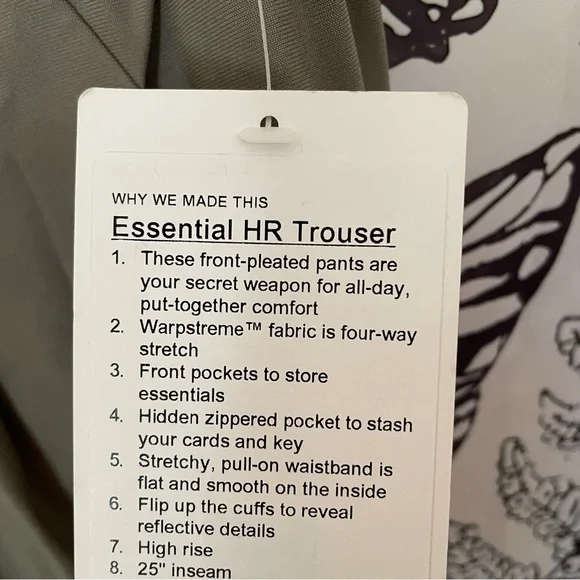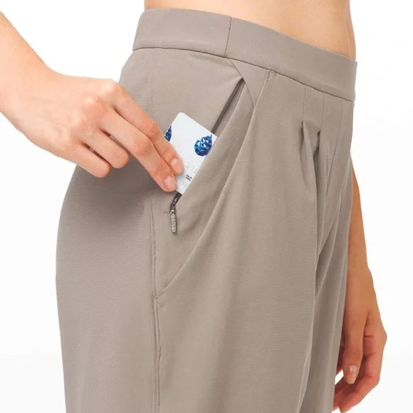 NWT LULULEMON ESSENTIAL HR TROUSER HIGH RISE SIZE 10 CBND CARBON DUST These front-pleated pants are your secret weapon for all-day, put-together comfort.warpstreme™Sweat-wicking Warpstreme™ fabric is four-way stretchsweat-wickingfour-way stretchfeaturesDesigned for: On the MoveStorage: Front pockets to store essentialsSecure pocket: Hidden zippered pocket to stash your cards and keyStretchy waistband: Stretchy, pull-on waistband is flat and smooth on the insideReflectivity: Flip up the cuffs to expose reflective detailsHigh-rise: Keeps you feeling covered and secureInseam: 25"