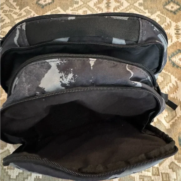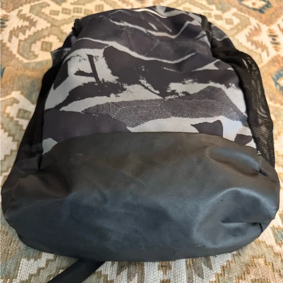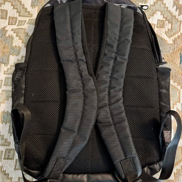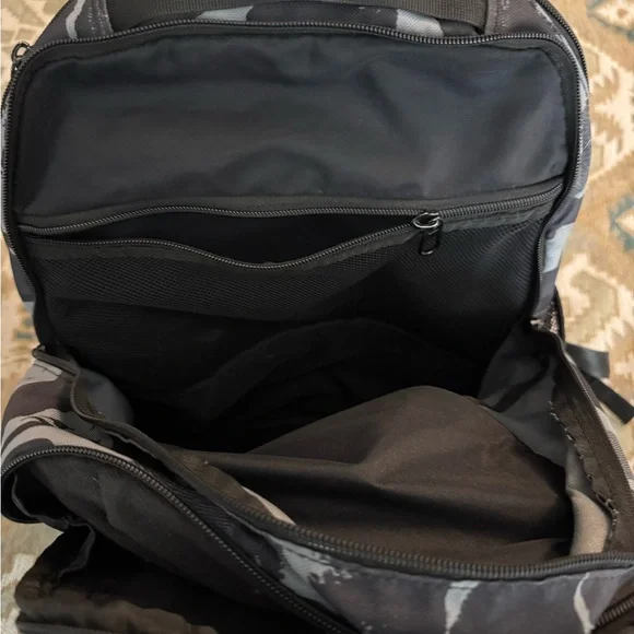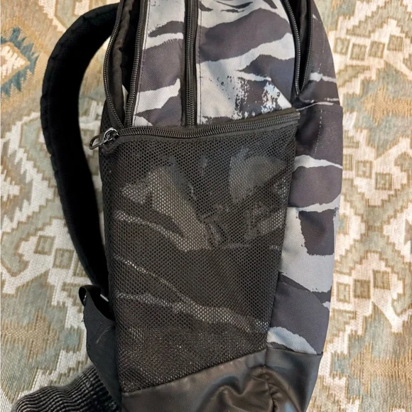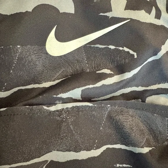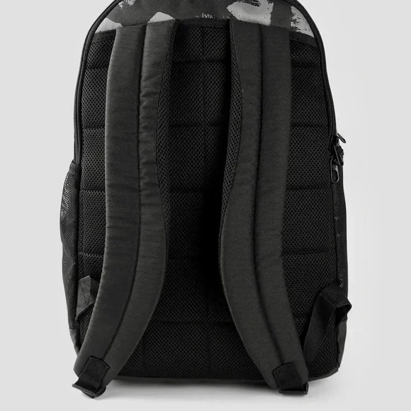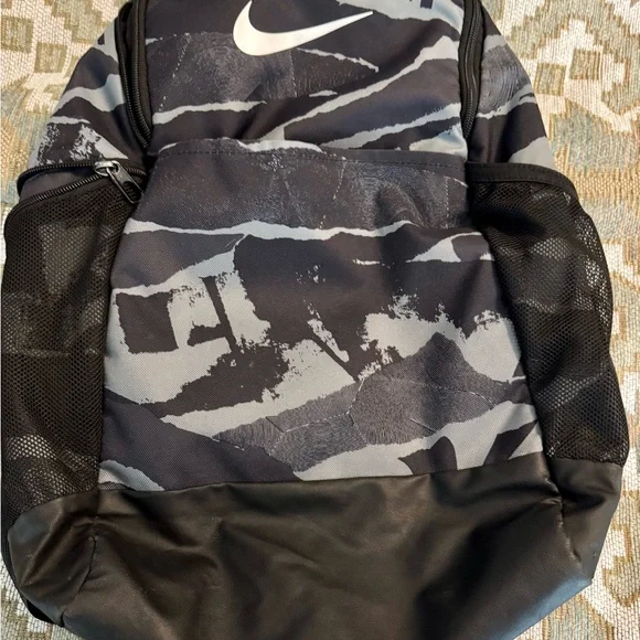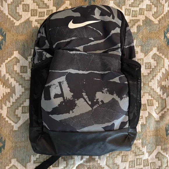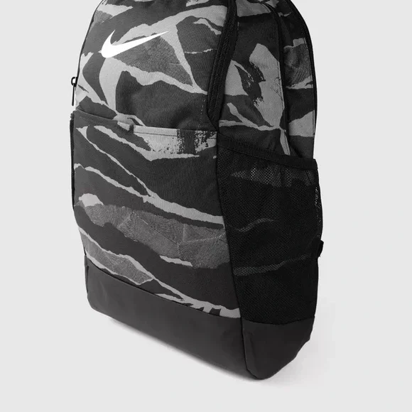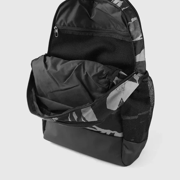 NIKE BRASILIA XL Camo Laptop Backpack (Gray/Black) Camouflage Stylish and durable, this Nike backpack in black and gray is perfect for everyday use. Ideal for carrying essentials with ease and comfort.About Nike Brasilia Printed 14 Inch Laptop BackpackThe Nike Brasilia Backpack has easy-access compartments to keep your gear organized and ready to use. With a zippered sleeve for your laptop, you're all set to hit the gym any time.Product Design Details* Black and grey abstract print laptop backpack* Padded ergonomic shoulder straps, has non-padded haul loop* 2 main compartment with zip closure, has padded laptop compartment* 2 external pockets, 2 side zip pockets*Padded mesh backModel Size & FitHeight: 19”Width: 12”Depth: 5”Laptop compartment can hold Up to 35.5 cm (14 inches) laptopMaterial & CarePolyesterWipe with a clean, dry cloth when need