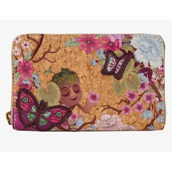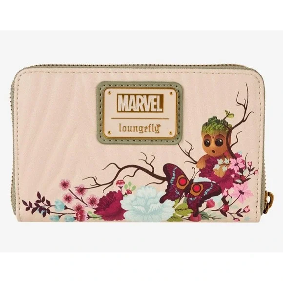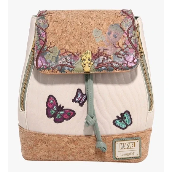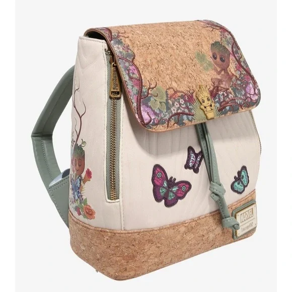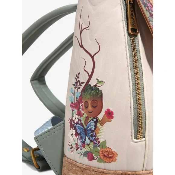 Introducing the NEW Loungefly Marvel Guardians of The Galaxy Groot Floral Backpack and Wallet set! This medium-sized rectangular backpack features a unique floral pattern with accents of Groot from Marvel's Guardians of The Galaxy. The blueish green double handles and bronze hardware add a stylish touch to the colorful design. Perfect for travel, parties, or casual outings, this limited edition backpack includes adjustable straps and pockets for added convenience. Made from polyurethane with a canvas lining, this slouch backpack is sure to make a statement with its cartoon-inspired theme and Marvel-inspired character design.