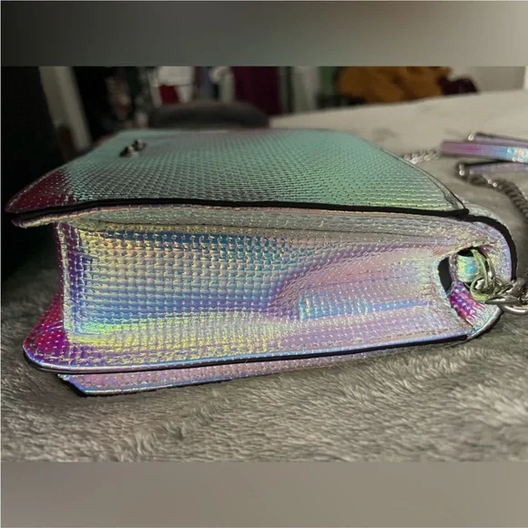 Ultra Rare hard to find Authentic Rebecca Minkoff Iridescent Opal Mini Love Crossbody Shoulder Bag HandbagCutest iridescent opal bag! Color change in light / sunshine, super super pretty!One of my most favorite purse. I would love to keep it but I have too many bags. Price is going to be pretty firm on this. I kinda want to keep it.Very rare opal iridescent hologram holographic holo mermaid rainbow 🌈 Shift effortlessly from day to night with this luxurious leather bag that features a removable chain strap for use as a clutch or crossbody. Card slots and an outer pocket keep all of your essentials organized around the clock.8" W x 5.5" H × 1.75" DLeatherLinedTurn-lock closureInterior: five card slotsExterior: one slip pocketImportedRare basket-weave textured iridescent leather front flap compact crossbody bag. Holographic lavender chrome exterior, adjustable chain and leather.Tag iridescent opal mermaid unicorn rainbow holographic hologramExcellent condition besides there’s one small spot on front (last photo). Nobody will actually notice, it’s really hard to see because of their iridescent patterns. I barely notice it but want to mention. See photos for any details or wear/use.Come with dust bag.