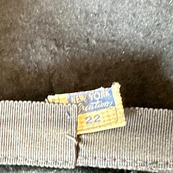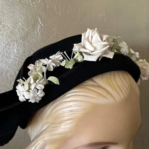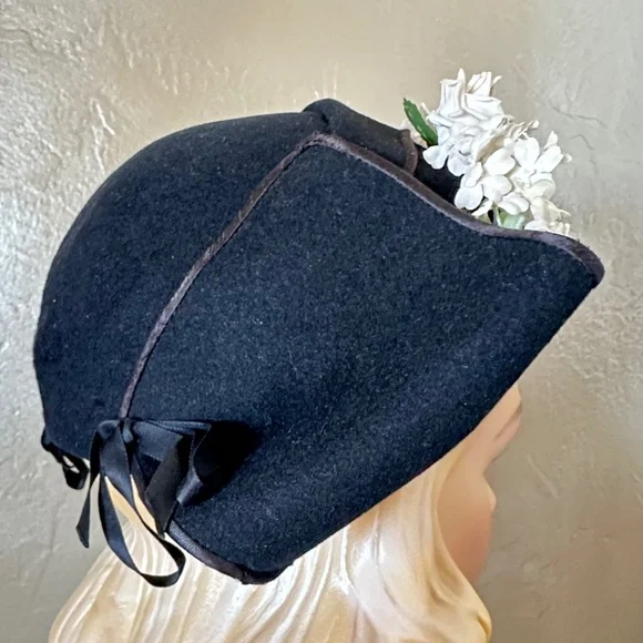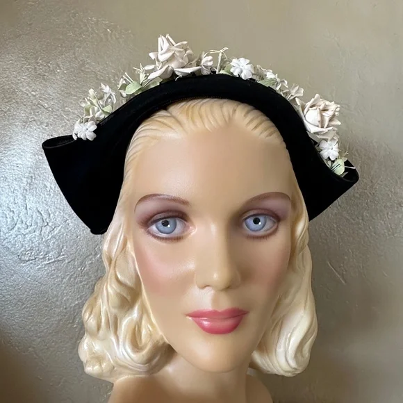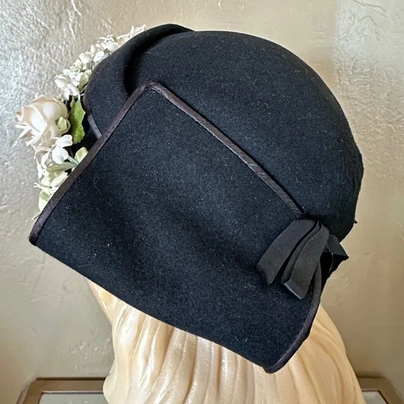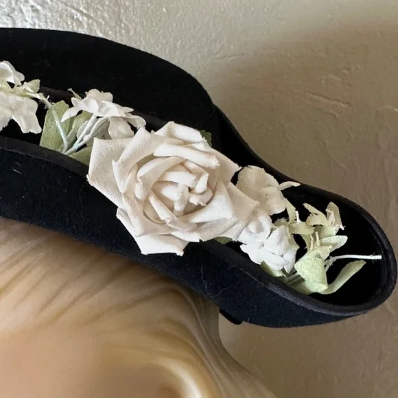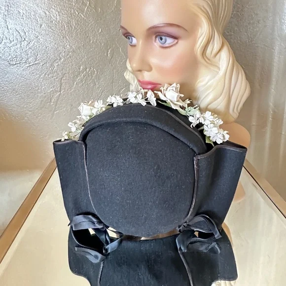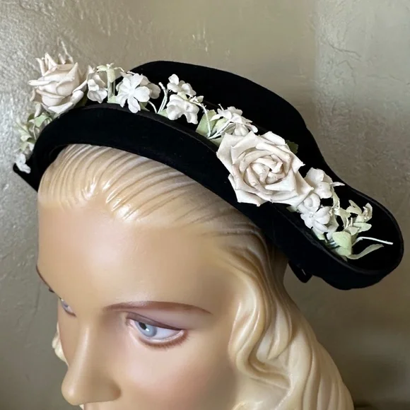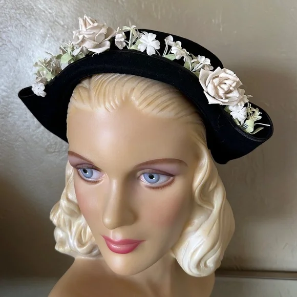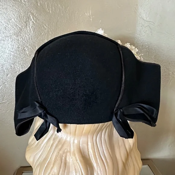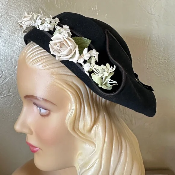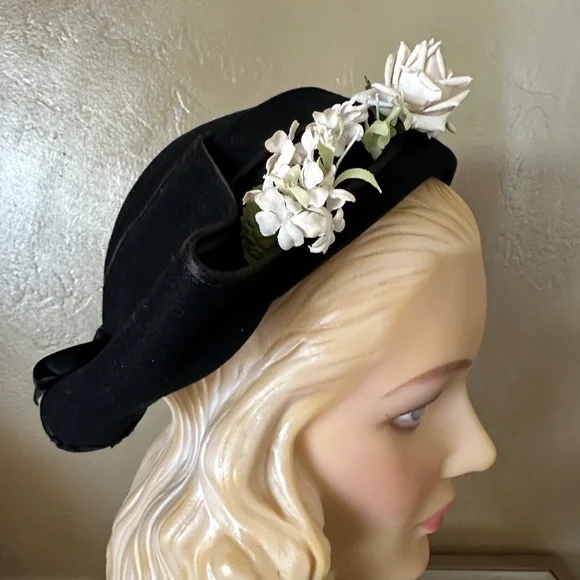 This hat is an outstanding millinery creation from the 1940s'! The felt hat has a round criown that sits back on the head, and has two pieces of felt folded and attached to the sides, edges in a shiny black fabric. All around the top there are stunning little white flowers and leaves created with intricate details. This hat is a joy to see and admire!Label: NEW YORK CREATION, Size 22The New York Dress Institute was formed in 1941 by fashion publicist Eleanor Lambert as a joint venture between the clothing manufacturers of New York City & the ILGWU. The label was created by a group of well-known designers who wanted to remain anonymous & wanted to support the New York Creation label & keep it competitive with French styles of the era. The label is small, white and blue & most of the time it states the hat size…22 or 23, or ADJUSTABLE.This is an authentic piece of fashion history! This hat is in wonderful vintage condition & has been lovingly preserved among over 1300 vintage hats we have collected for 40+ years. Feathers, straw, flowers & veils are fragile, given their age. Mannequin not for sale.