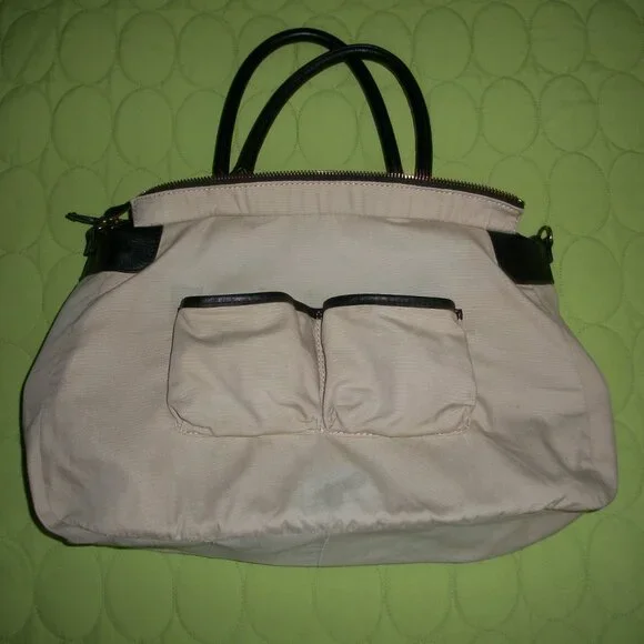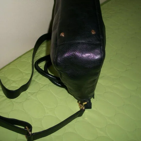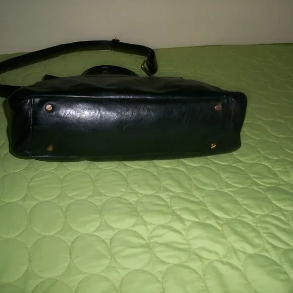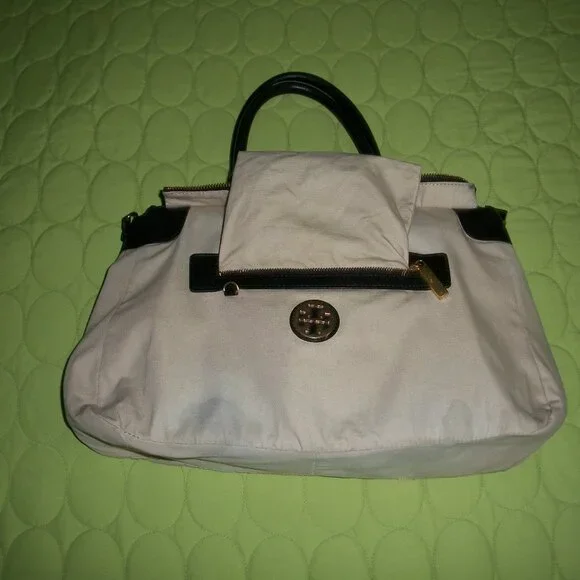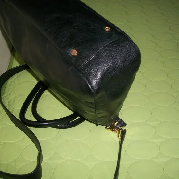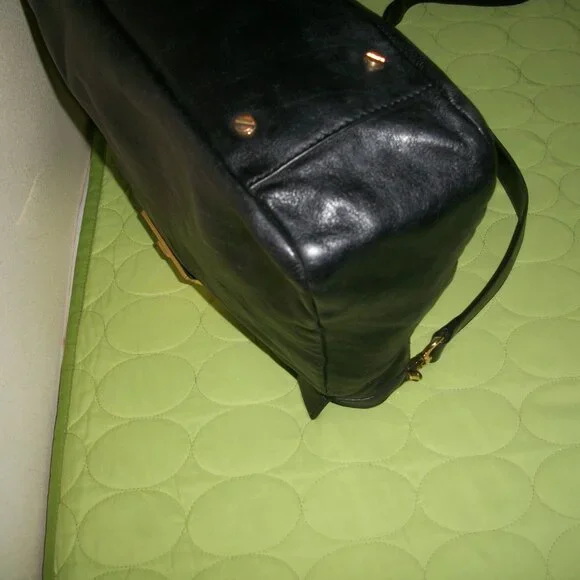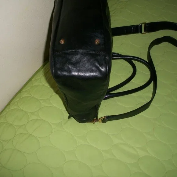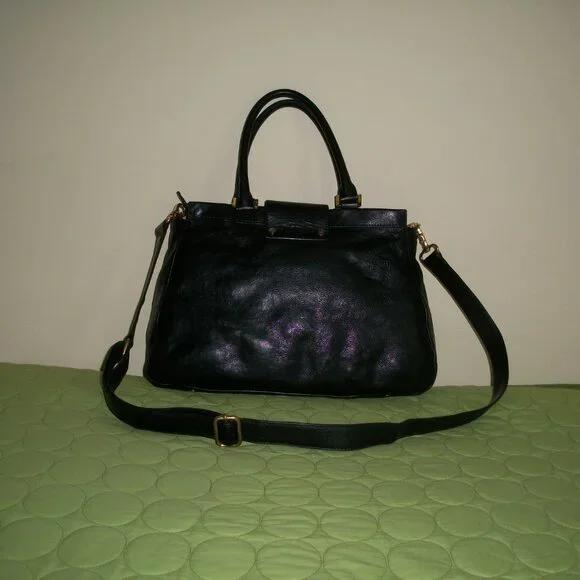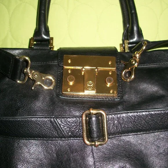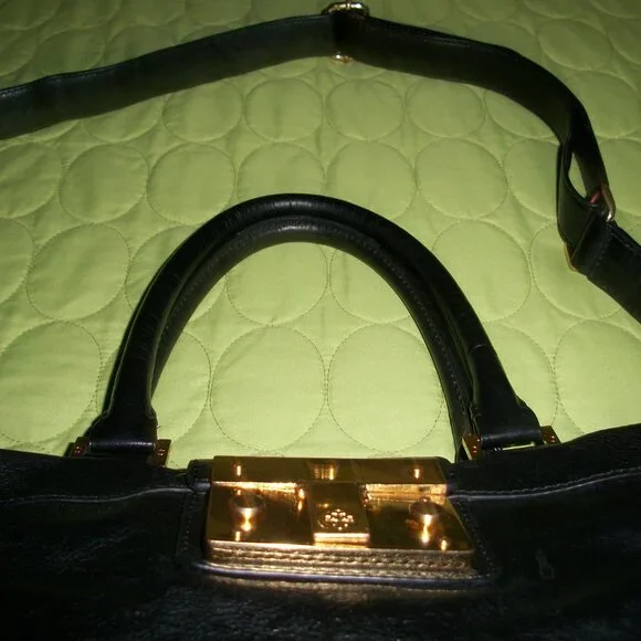Beautiful TORY BURCH Black Leather Holland Sachel/Crossbody Bag witch features gold hardware, silky soft leather body, zippered on top, front flap with push-lock closure and stacked T logo detail, detachable adjustable 24" crossbody strap, interior tan fabric lining with zipperred wall pocket, two slip in pockets & protective feet. The bag has been cleaned by hand, but lining has some light stains, gold hardware shows wear and inner part of one handle shows wear, overall the bag is in a good pre-owned condition.L 15" H 10" W 4" Handles 7" Strap 24"