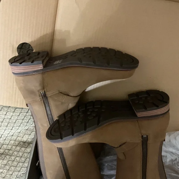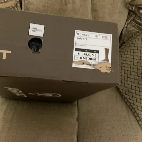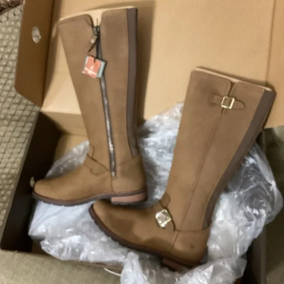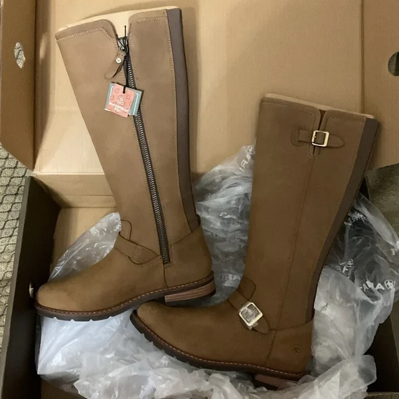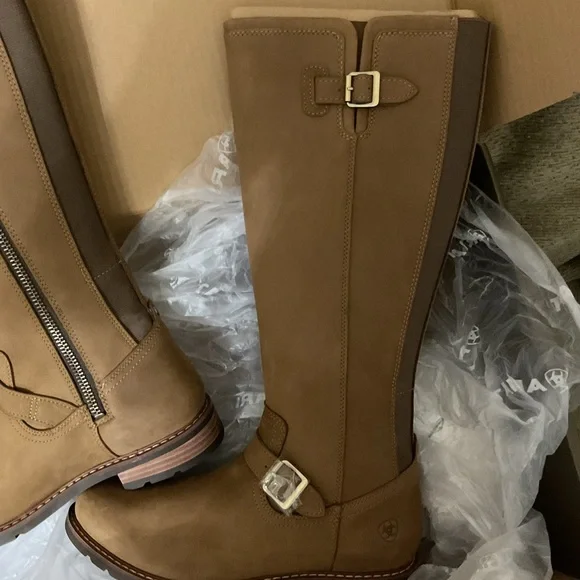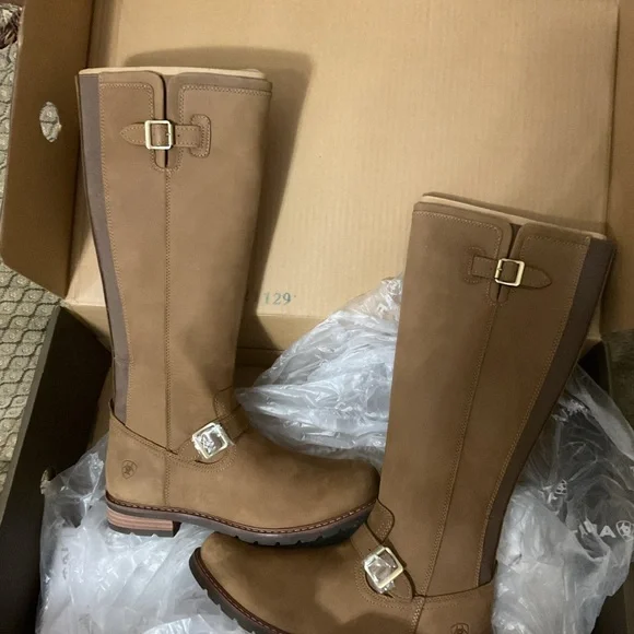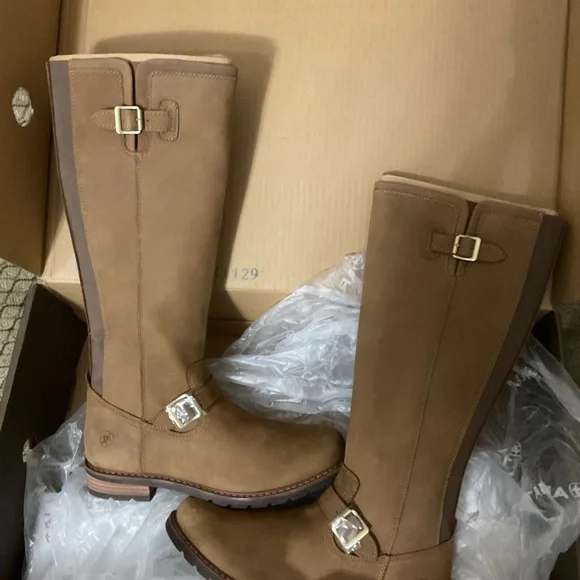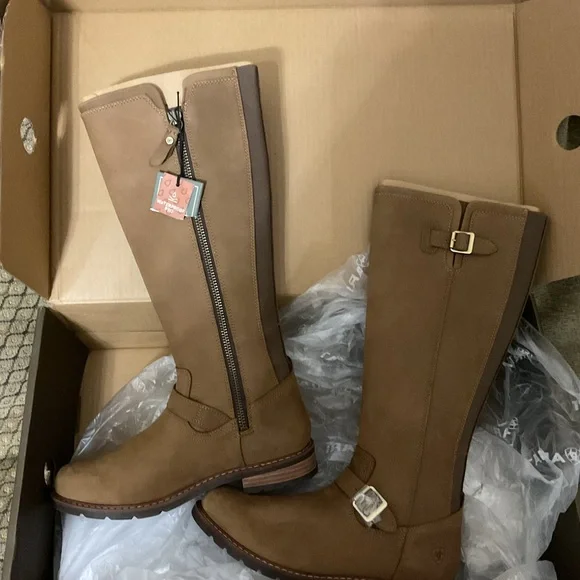 these retail for $289.95…These are new in box never worn . The box does have some shelf wear .Size 8 B medium.Exude countryside elegance in the Sadie waterproof boot. A sister to the best selling Savannah, they offer protection from the elements with premium full-grain waterproof leather lined with classic plaid.Style No. 10038383Size 8 B15" height1" heel heightRound toeFeaturesATS® technology provides ergonomic support on uneven terrainDRYShield™ waterproof construction keeps you dry in wet environmentsRemovable All Day Cushioning insoleDuratread™ sole is extremely durable while still letting your foot flexFull-length elasticized panel.