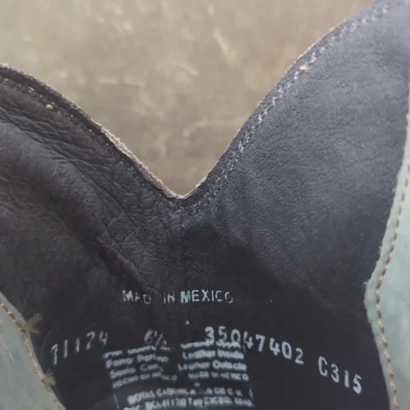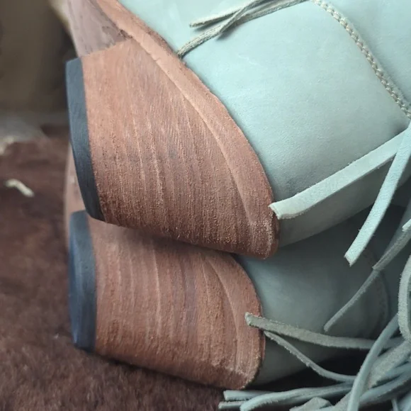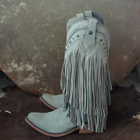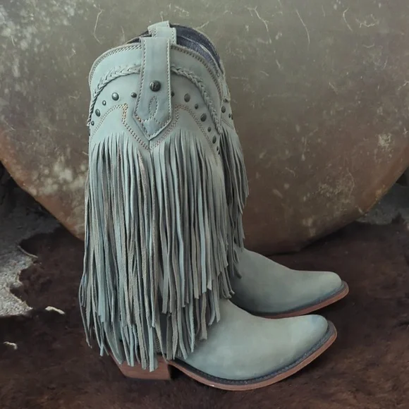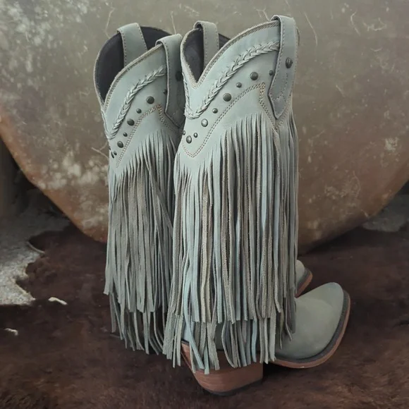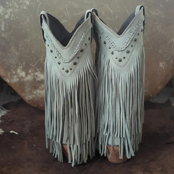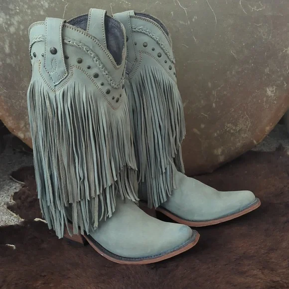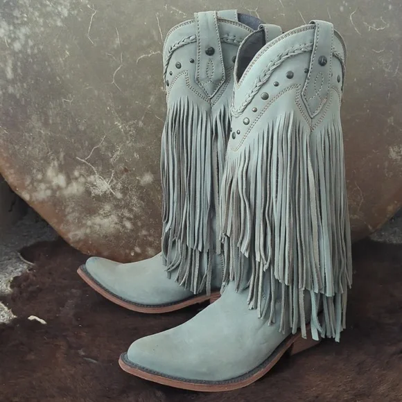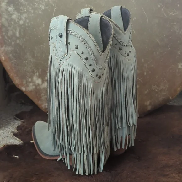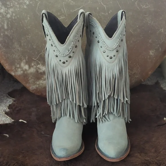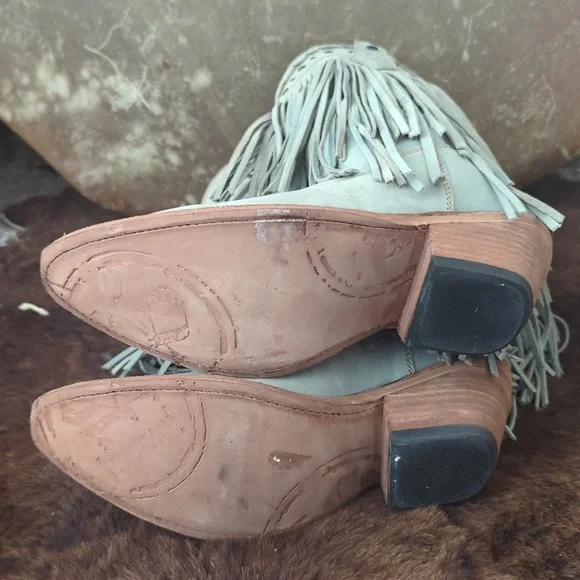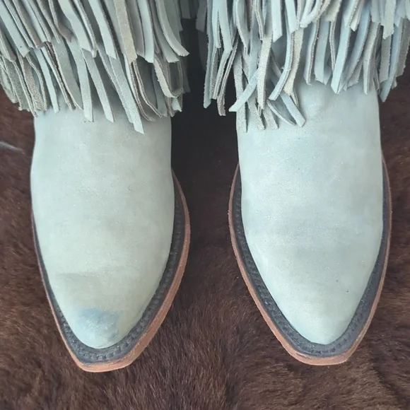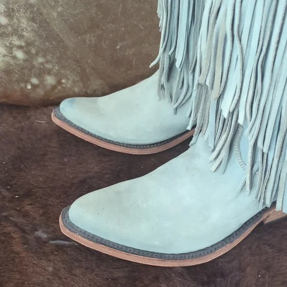 The LIBERTY BLACK Fringe Boots in Ciel have just enough color to add a statement, but stay versatile. Style #LB71124, color name Ciel, which is a cool icy blue /mint green color. This gorgeous brushed nubuck type leather is as soft as it is beautiful. Long tiered fringe on shaft, studded accents along collar and on pull tabs and a pretty leather braid accenting top of boot collar. These boots are the perfect pop of color for any season or outfit! Handmade, high quality boots with a stacked leather riding style heel, leather pull tabs, leather outsoles, snipe toe, lightly cushioned leather insoles, and full pigskin leather lining. These boots are no longer made in this color and are very hard to find. Measurements:Shaft Height - 13"Heel Height - 2"Size 6.5 (ladies regular width)Excellent pre-owned condition. Worn only 2X in a rodeo queen pageant. Sprayed with quality leather protector prior to wear. Very light wear on leather soles, slightest wear or drag on heel caps, small rub on left toe end (please see pics), slight wrinkling of leather at heel backs & across tops of toes. Do not come in original Liberty Black boot box.Smoke free & pet free home.Check out my other listings for tons of girls & ladies western/rodeo clothes in many sizes.Loads of western shirts, jeans, slim jeans, and boots. Great brands such as Wrangler, Tin Haul, CORRAL, Macie Bean, Rock & Roll Cowgirl, Ranch Dress'n, Fallon Taylor, Cowgirl Tuff, Cowgirl Hardware, Cinch, and more.