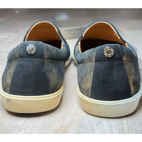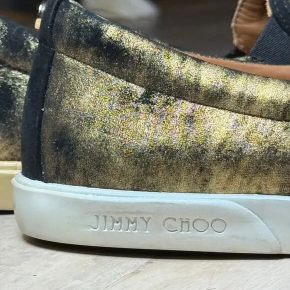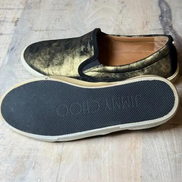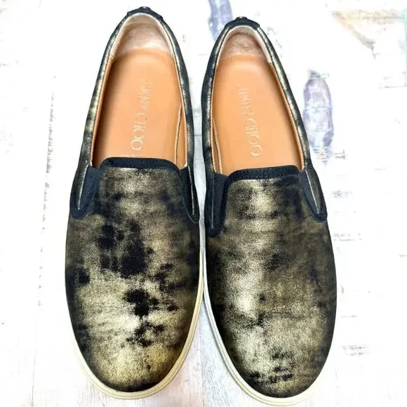 Step into luxury with these authentic Jimmy Choo metallic gold velvet slip-on sneakers in size 39 Featuring a soft textured upper, sleek black elastic accents, and a white rubber sole, they effortlessly blend designer elegance with everyday comfort. Perfect for casual looks or elevating a streetwear vibe. Made with premium materials and high-end construction. A true statement piece for the fashion-forward wardrobe.