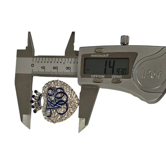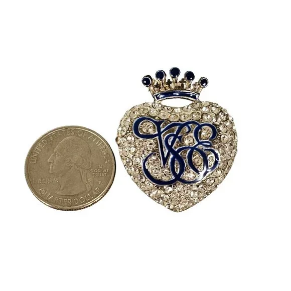 Orient Express Crown Heart Clear Rhinestone Blue Enamel Brooch Pin L234This gorgeous Heart Brooch features the Venice Simplon Orient Express logo in blue enamel.The glamorous heart pin is lavishly embellished with clear faceted rhinestones pave-set on the silver tone base, that magnificently sparkles especially when it catches light.The top has a crown design with a blue enamel accent matching the logo.Measures approximately 1.5 inches in length.The back is stamped with theVenice Simplon Orient Express logo with a crown on top, secured with a straight pin that functions properly, allowing this piece to be easily attached to clothing or accessories.Ensuring it stays firmly attached and you can confidently showcase this pin without worrying about it coming loose or falling off.Please carefully review the images because they are part of this listing and reflect important details, sizes, and information. Images often reflect items larger than their actual size. This is unavoidable and necessary to provide accurate photo details of items. Small jewelry busts, not life-size busts, are used in necklace photos. Most items come packaged in our It Still Glitters store box. Unless expressly stated in this listing, the item does not come with an original box, pouch, or packaging. We are happy to combine ship upon request, but please add all items to your cart before submitting payment.Add us to your fav and sign up for our occasional email so you'll be in the loop w