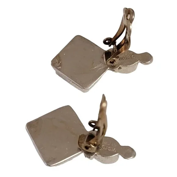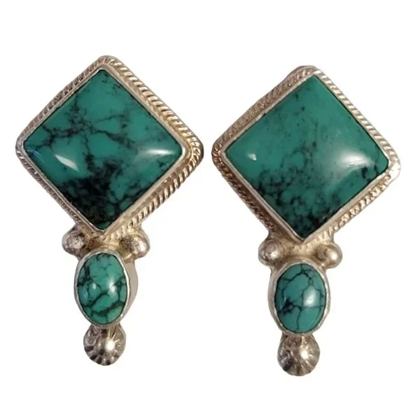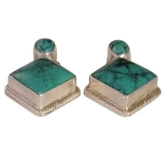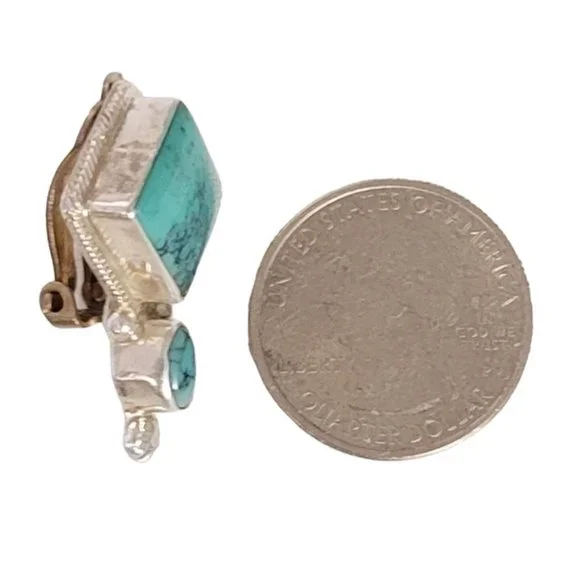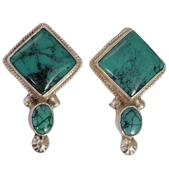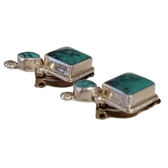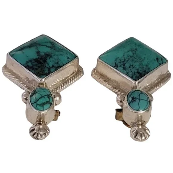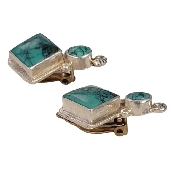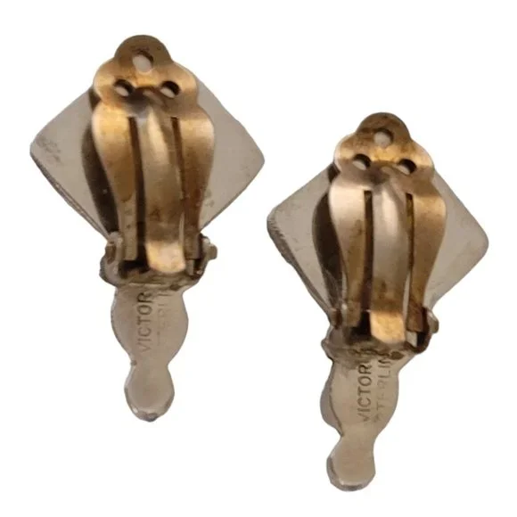 Victor Sterling, Turquoise Square Oval Clip-On Earrings, Signed E1These versatile accessories pair well with a wide range of outfits and will also make a fabulous gift for those who adore exquisite and chic costume jewelry. Crafted in a sterling silver square-shaped base with Turquoise inlays showcasing attention to detail with the oval-shaped accent below, completes the beautiful design of these pieces.Each earring measures approximately 1.2 inches in length.Both earrings are hallmarked VICTOR STER on the reverse.The clip-ons are comfortable and stylish and make a great jewelry option for those who don't have their ears pierced. Please carefully review the images because they are part of this listing and reflect important details, sizes, and information. Images often reflect items larger than their actual size. This is unavoidable and necessary to provide accurate photo details of items. Small jewelry busts, not life-size busts, are used in necklace photos. Most items come packaged in our It Still Glitters store box. Unless expressly stated in this listing, the item does not come with an original box, pouch, or packaging. We are happy to combine ship upon request, but please add all items to your cart before submitting payment.Add us to your fav and sign up for our occasional email so you'll be in the loop when we add awesome new pieces or have pop-up sales. Please note that if your purchase includes a 10k, 12k, 14k, 18k, etc. piece with a clasp, there may be