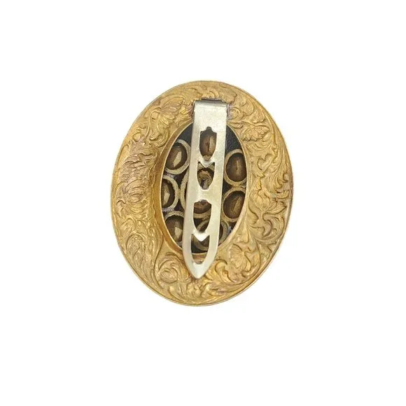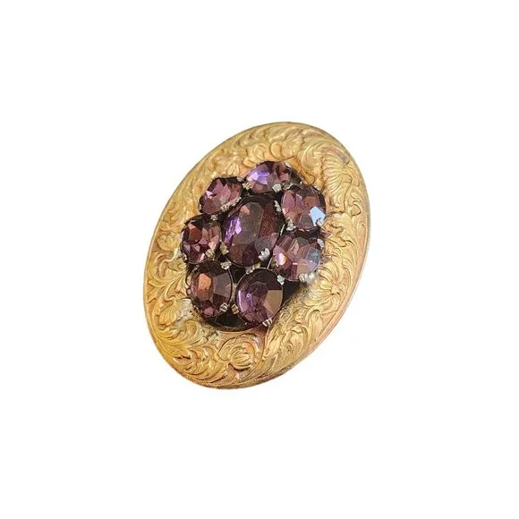 Vintage Wonderful Detailed Brass and Prong Set Glass Dress Clip (A3106)Size: about 3"Color: Gold, PurpleCondition: Very good vintageSigned: NoneDetails: There are beautiful details on the brass and nice stones at the center.Please look at all the photos, as they are part of the description. I try my best to point out any flaws.Also please remember this is a preloved piece and may show signs of light wear, marks, scratches, etc.I will be posting a lot more jewelry, Keep checking back.