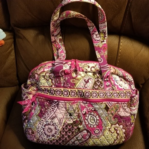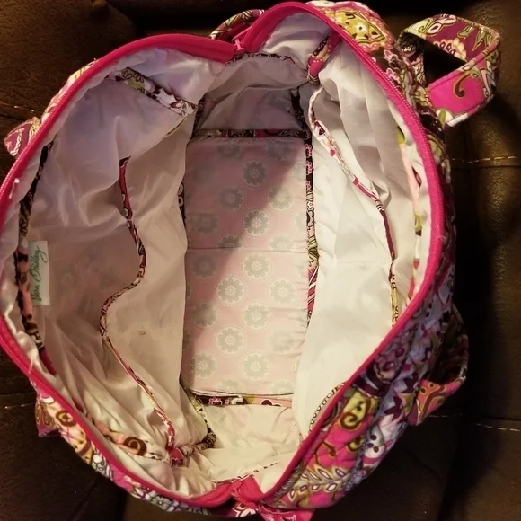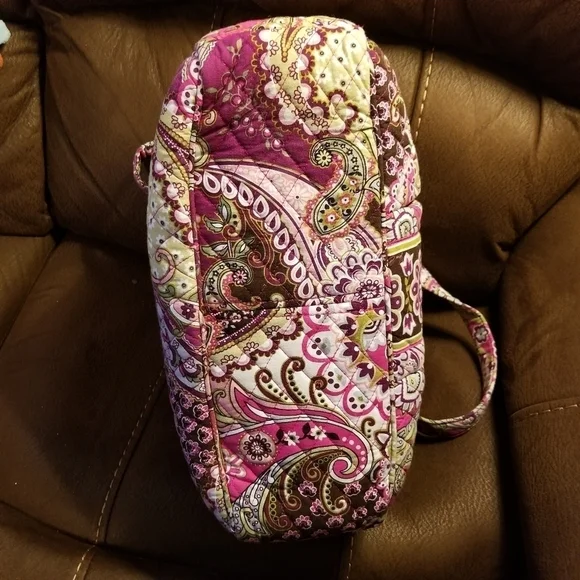 Very Berry Paisley was voted Vera Bradley's most popular pattern ever! This retired diaper bag is gorgeous and ready to go everywhere! The handles are still nice and the bag is clean. It is lightly used but no stains or issues. Tons of pockets and the inside is nylon for quick dry and no stain should something get spilled. Non-smoking home measures about 18 x 5 x 11 inches