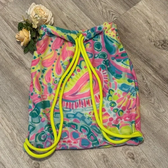 New Without tags! This Lilly Pulitzer Cinch Drawstring Bag Backpack is perfect for any occasion, whether it's a day at the beach or a casual day out. The bag features a beautiful floral pattern and a yellow shoulder strap. It has a drawstring closure and is made of lightweight material, making it easy to carry around. The bag is large in size, with a width of 13.5" and a height of 16". The exterior is made of multicolor material, which can be seen in the tag photo. The bag also has accents of the Lilli character and the Lilly Pulitzer logo. It is not a handmade item and is not vintage. The bag is part of the Lilly Pulitzer product line and is perfect for women.From a smoke free pet free home. Ships next day.