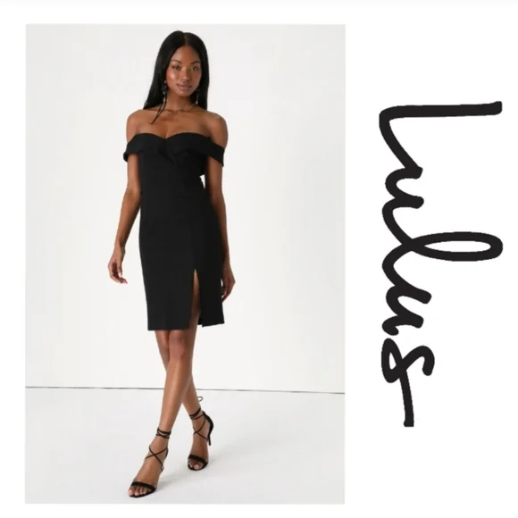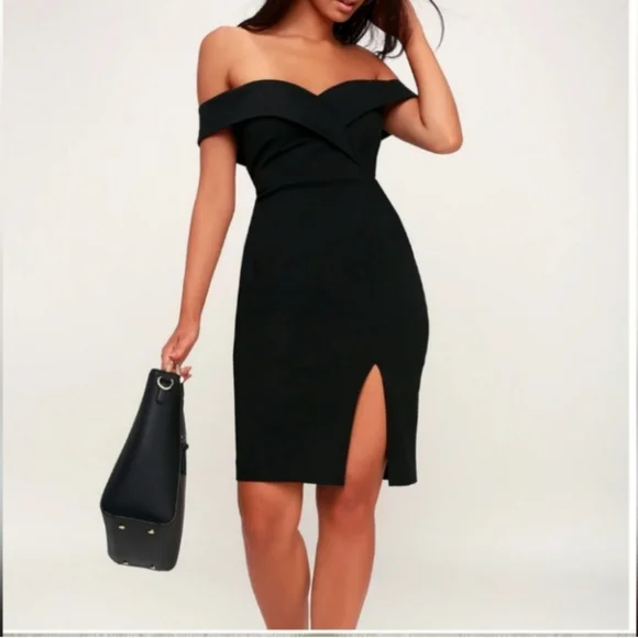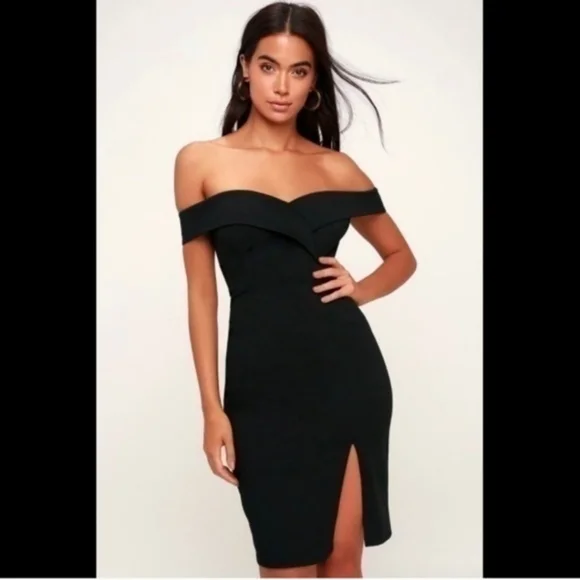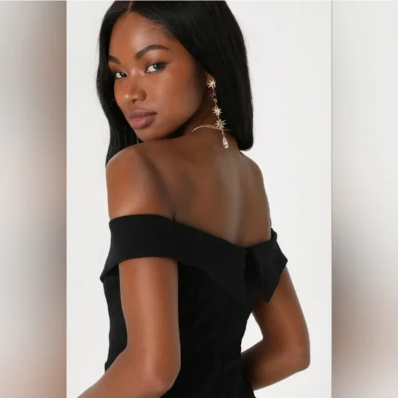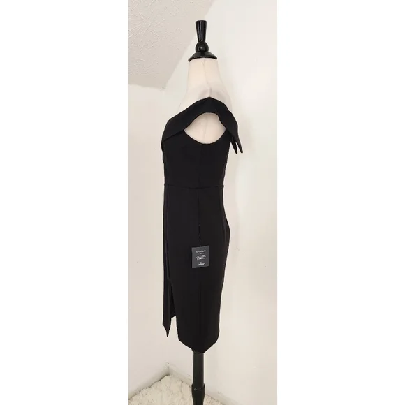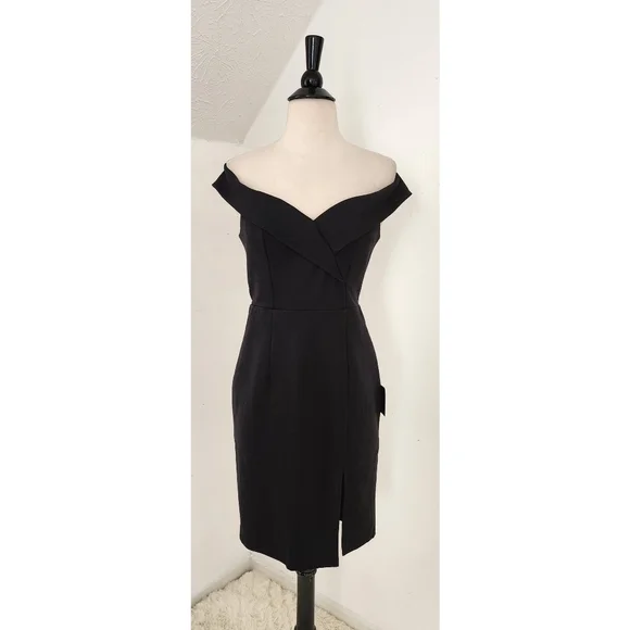 DETAILS • Off-the-shoulder neckline (with hidden no-slip strips)• Princess-seamed bodice• Fitted waist • Bodycon skirt with side slit• Hidden back zipper/clasp• Fit: This garment fits true to size.• Bust: Works best for A to C cup sizes.• Waist: Fitted - stretchy fabric allows custom fit.• Hip: Fitted - stretchy fabric allows room for hips.• Undergarments: May be worn with a strapless bra, adhesive bra, petals, or no bra.• Fabric: Fabric has some stretch.• Size Medium • New With Tags