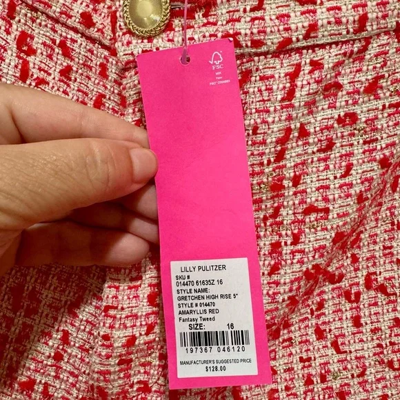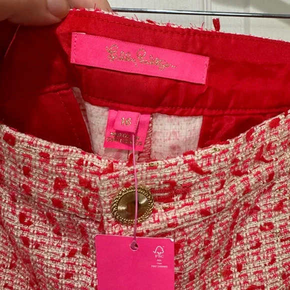 Lilly Pulitzer 5" Gretchen High Rise ShortSize 16 (no stretch)Elevate your wardrobe in the 5" Gretchen High Rise Short. This flattering high rise design has a straight fit, front fly design.• High rise, front fly, straight fit tweed short.• 5" Inseam.• Fantasy Tweed (51% Polyester, 31% Acrylic, 8% Nylon, 8% Rayon, 2% Other Fibers).• Hand wash cold, separately, or dry clean.