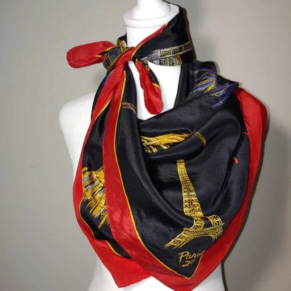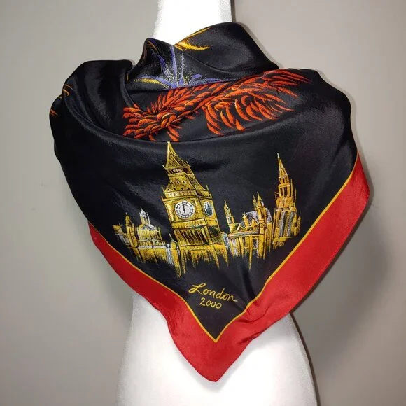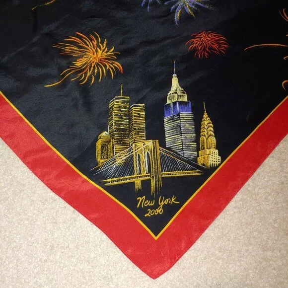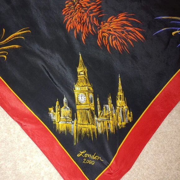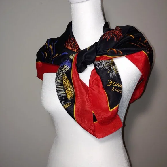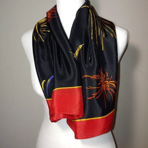 Liz Claiborne New Year 2000 Celebration !00% Silk Scarf Black Red OSPre owned like new100% Silk Made in JapanCare and Content tag cut off so it would not damage the silkBeautiful firework to celebrate Europe New Year 2000Measurements Apx:34"x32"Silk, Whimsical, Festive, Elegant, Classic, Whimsigoth, Feminine, Vintage, Offers welcome
