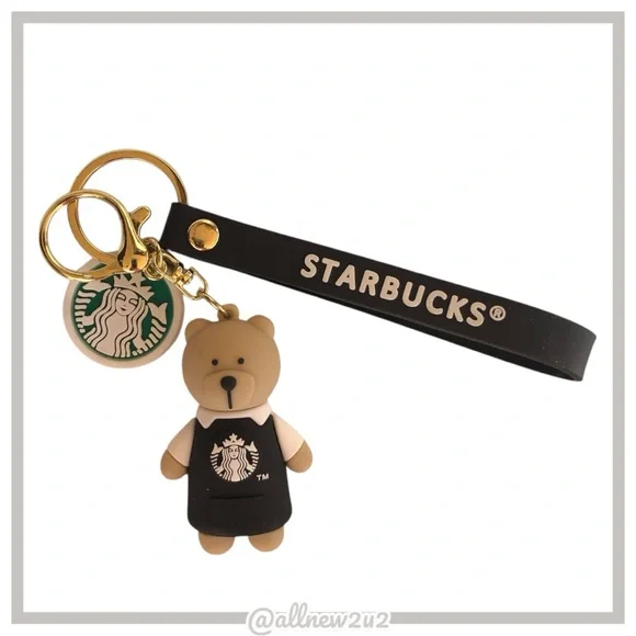 Adorable bear keychain with Starbucks logo. Includes a paper clip with cup design. Ideal for coffee enthusiasts.