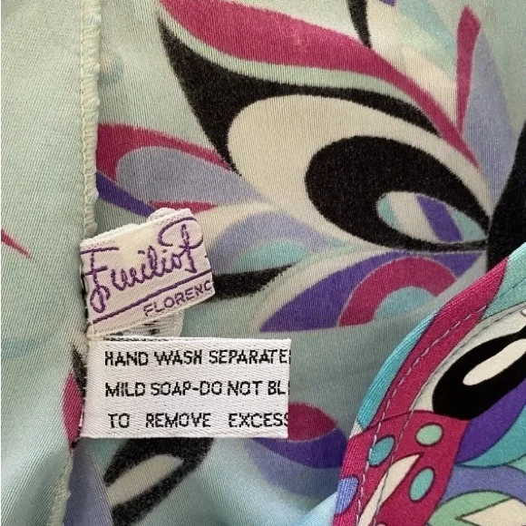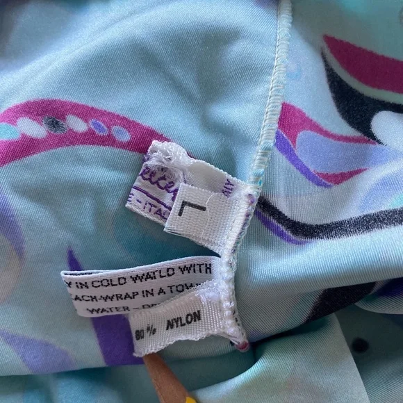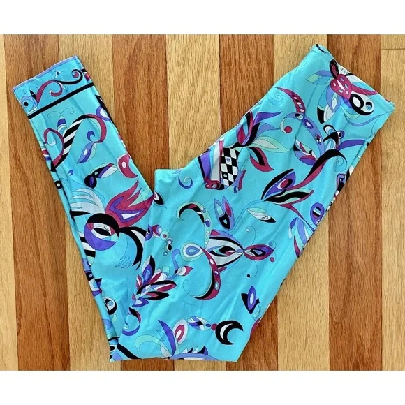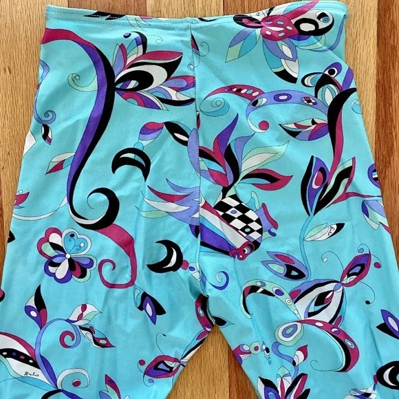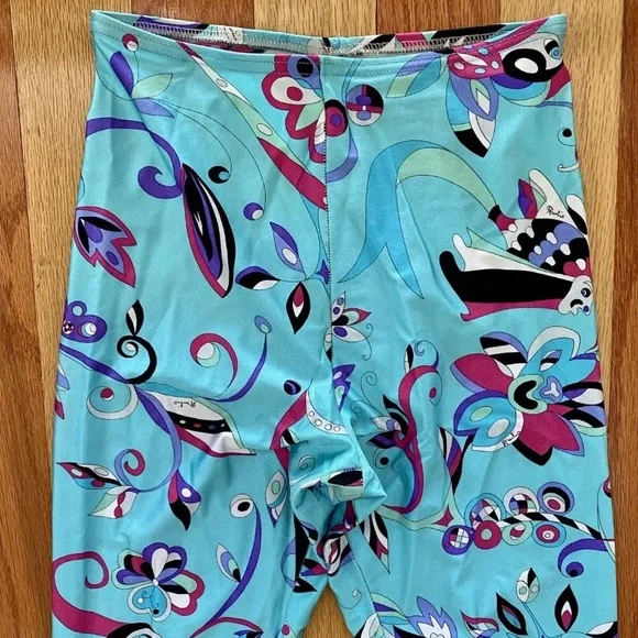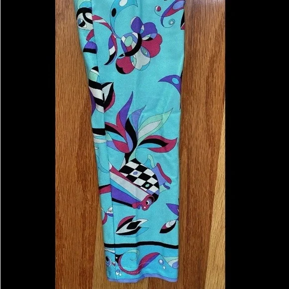 These are the epitome of signature Pucci design! They date from the late 1980s and were purchased at the Emilio Pucci flagship boutique in Florence, Italy (one owner).By Emilio Pucci, tagged ladies size large (run small).Stretch lycra knit leggings in a vibrant swirling print of fish, flowers, and geometric designs. Bright turquoise blue ground with hot pink, green, black, and purples. Band effect at the cuffs are part of the fabric print.Unstretched: Measures 12.5” across waistband, 37” outer seam, 28” inseam, 11” rise.These were maybe worn three times. Folded in a drawer since then. No flaws!!!My home is smoke free.