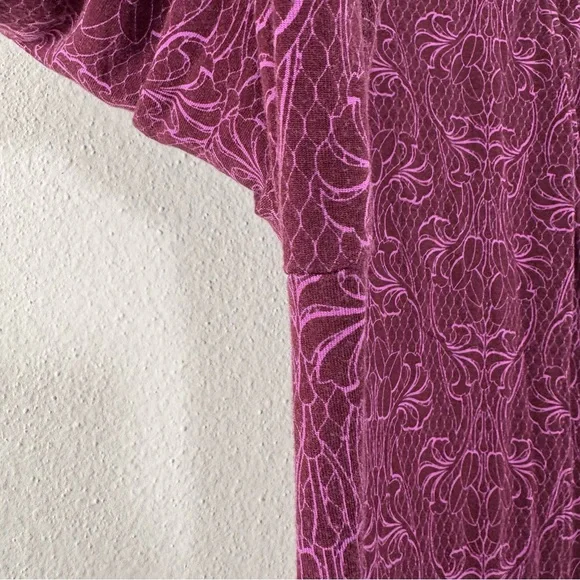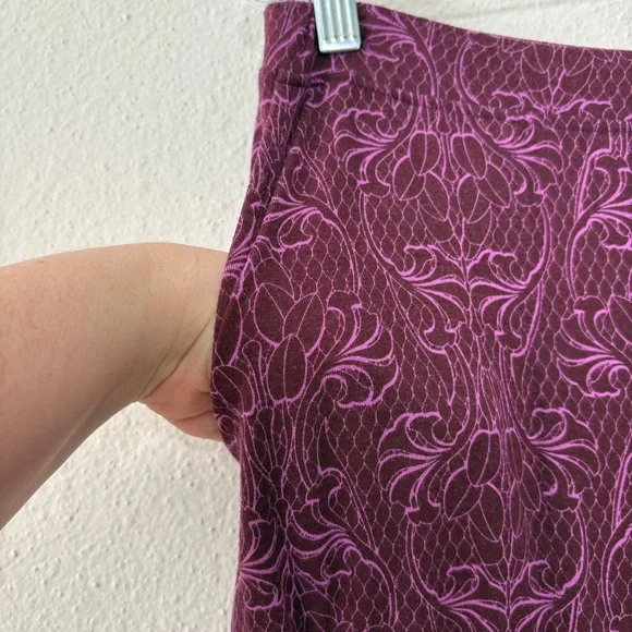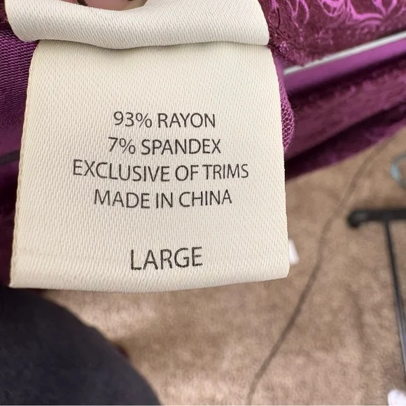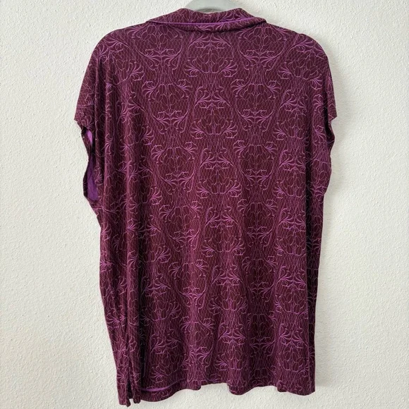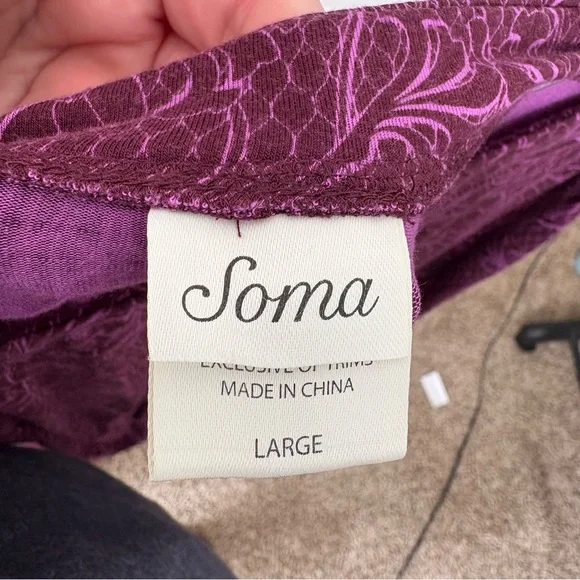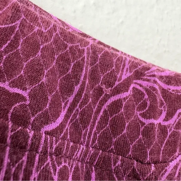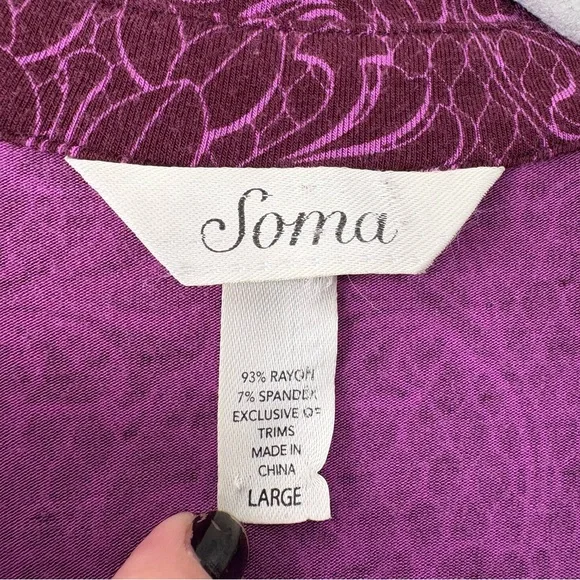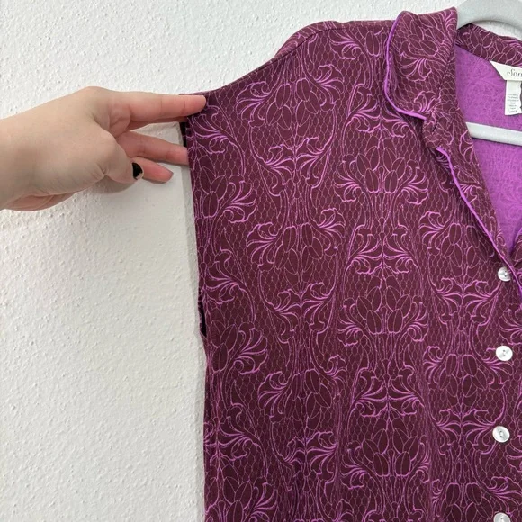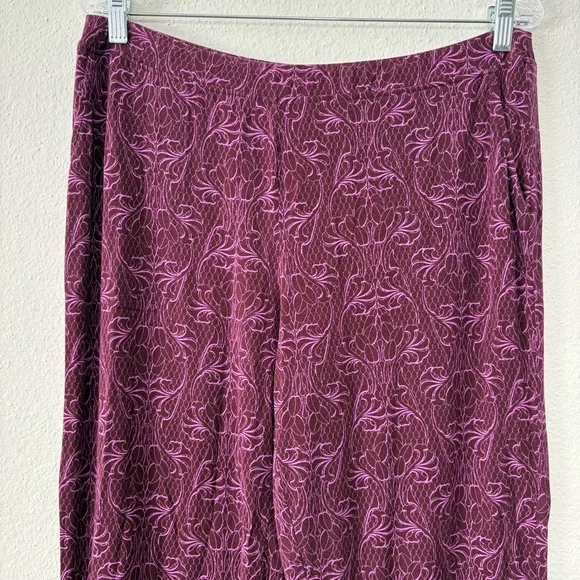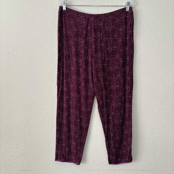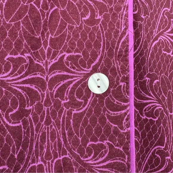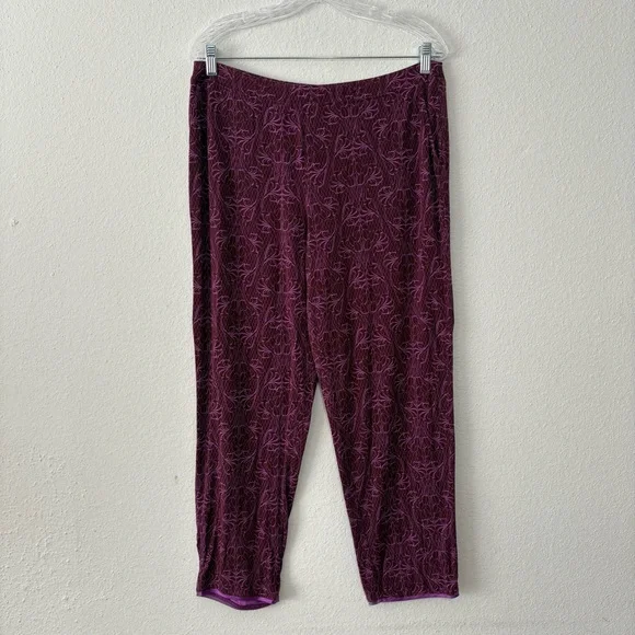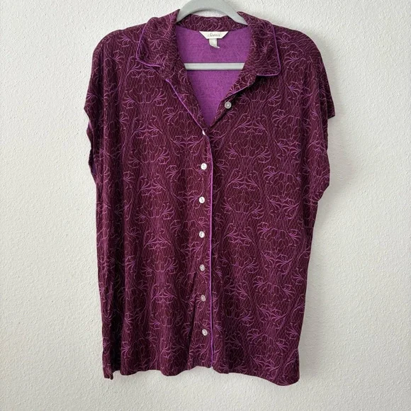 Great pre-owned condition: minimal wear with 1 thread pull on the elastic band on pants see photos Style tags: Loungewear, Intimates, Sleepwear, Cozy- 93% Rayon, 7% Spandex - Button front Top- Cap sleeve - Super soft and stretchy material- Artsy pattern - Purple color - Satin trim- Pockets- Pull onSize Large Measurements:Top:Length: 27in Chest: 22inBottoms:Length: 36in Waist: 16in Inseam: 27.5inWeight: 1lb 2oz