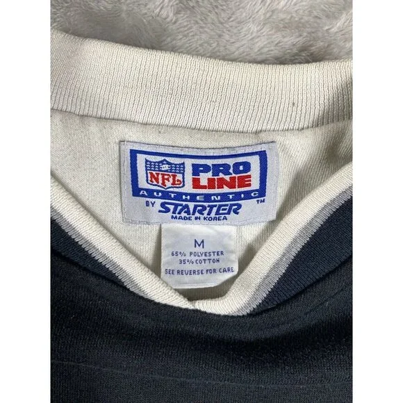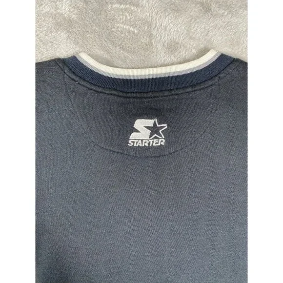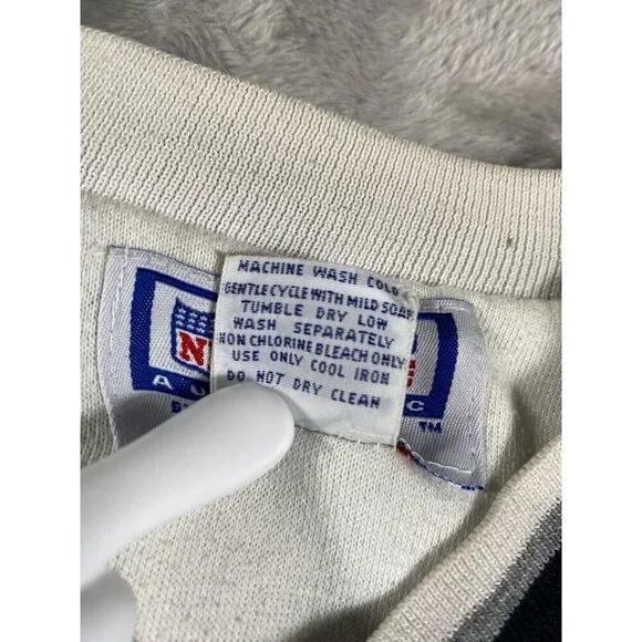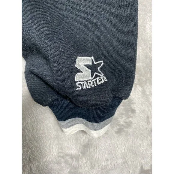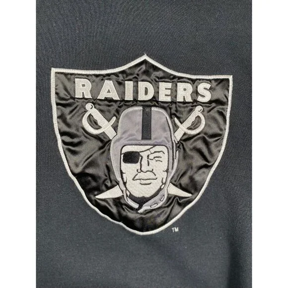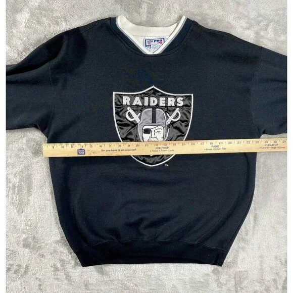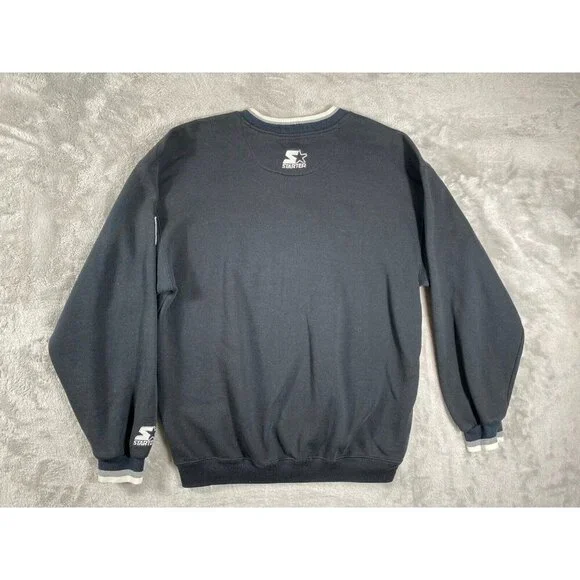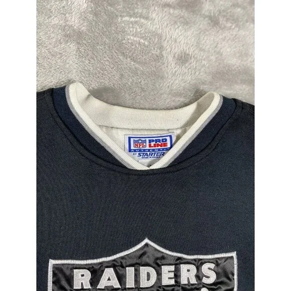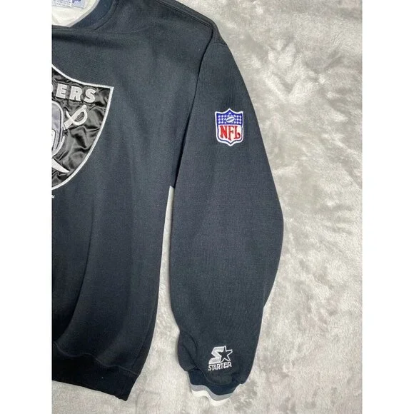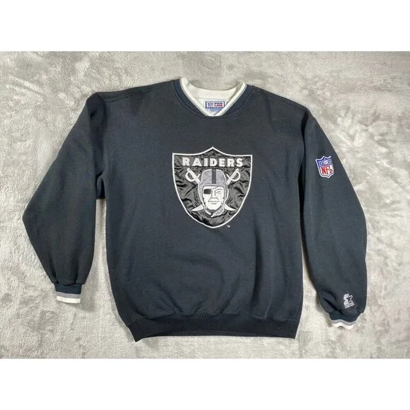 Description:This vintage 90s Raiders x Starter NFL sweatshirt is a must-have for any die-hard fan or collector. Featuring the iconic Raiders logo embroidered on the front, this pullover is a timeless piece of sportswear.Key Features:* Brand: Starter* Size: Men’s Medium (M)* Color: Black with white and silver accents* Design: * Embroidered Raiders logo on the chest* NFL patch on the sleeve* Starter logo stitched on the wrist cuff* Ribbed cuffs and waistband for a snug fit* Era: 1990s vintageCondition:Excellent vintage condition with minimal signs of wear. No holes, stains, or significant flaws.This retro Raiders sweatshirt is perfect for game day or as a stylish statement piece. A true gem for fans of the team and vintage sports apparel.