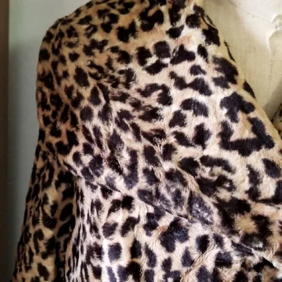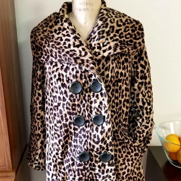 Original vintage 1960's faux leopard fur, shawl collar coat. Here's Jacqueline Kennedy (photo) wearing similar one. General wear but in good wearable condition.. commensurate with age ofcourse. Bust 42", waist 46", sleeve from shoulder 21.5", length from center back neck seam 32", shoulders 14.5". Fully lined. Side pockets.