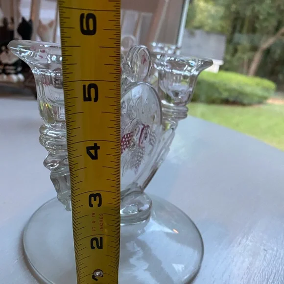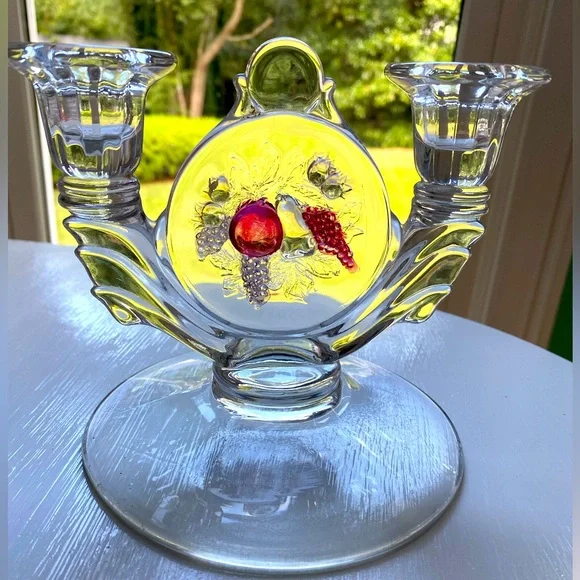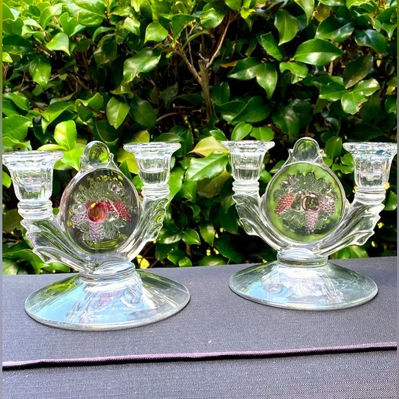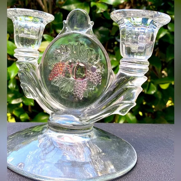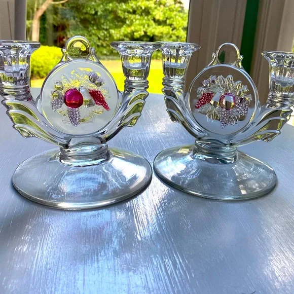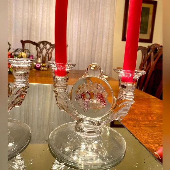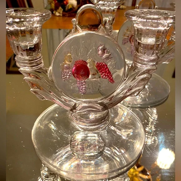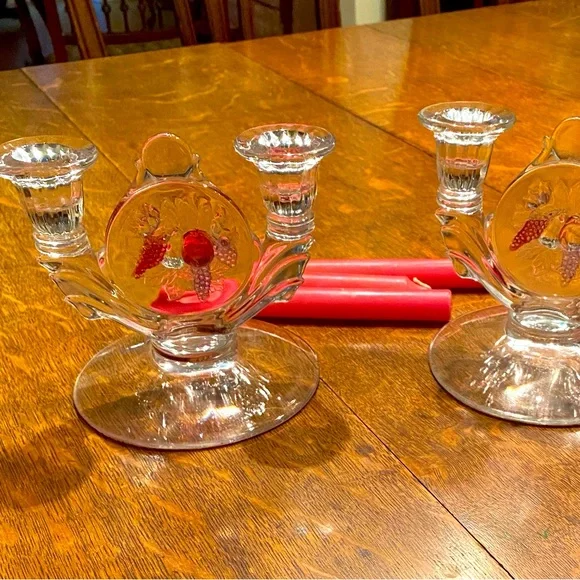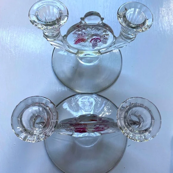 Vintage glass candlestick holders. Westmoreland Della Robbia . Each hold two candles. Double Candlesticks: 5 3/8" H.- 6 1/2" W.Della Robbia (1920s-1970s Dinnerware items through the 1950s) (crystal, crystal stained, green, pink, milk glass, pink, purple slag, ruby, opaque blue ) - Della Robbia was one of Westmoreland's more popular Depression Era patterns. It is still widely collected throughout the secondary market. .
