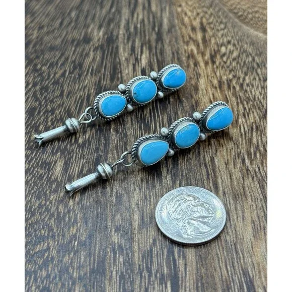 Add a touch of Native American heritage to your jewelry collection with these beautiful post dangle earrings. Handmade by Navajo artisan Debra Smith, these sterling silver earrings feature stunning Kingman Turquoise stones in a bezel setting. The old look of the earrings adds to their charm and appeal. Weighs: 17.5 gramsLength: 2 3/4”Width: 7/16”#9Reference coin is a quarter‼️Make sure to follow my store for new items posted daily!!💕