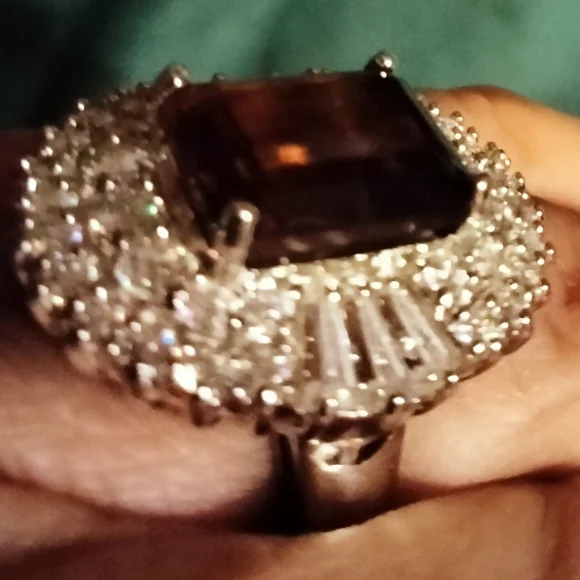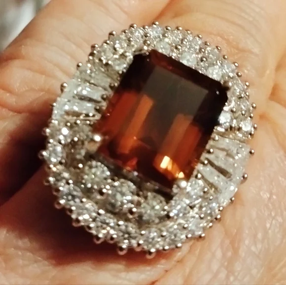 The Sparkle and Shine surrounding this Emerald Cut Santa Ana Madeira Citrine is breathtaking!Tapered and Round White Moissanite form a Halo giving beauty and grandeur to this Ring.This is a very big Statement piece!It says I have arrived!Elegantly created in Platinum Over Sterling Silver 8.60 ctw.Madeira Citrine represents less than 2% of all mined Citrines. From the Cantera Santa Ana mine in Uruguay This Ring glows from knuckle to knuckle