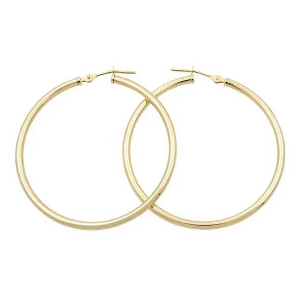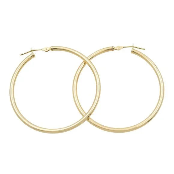 These medium hoop earrings are crafted in 14k yellow gold and feature the majestic glow of high polish finish. They are also available in 14k white gold and 14k rose gold. This pair of hoop earrings will make a fashion statement and definitely an eye catching pair. Size: 1.5 inches. 1.85 mm thickness. Comes with a presentable gift box.ID: 029360