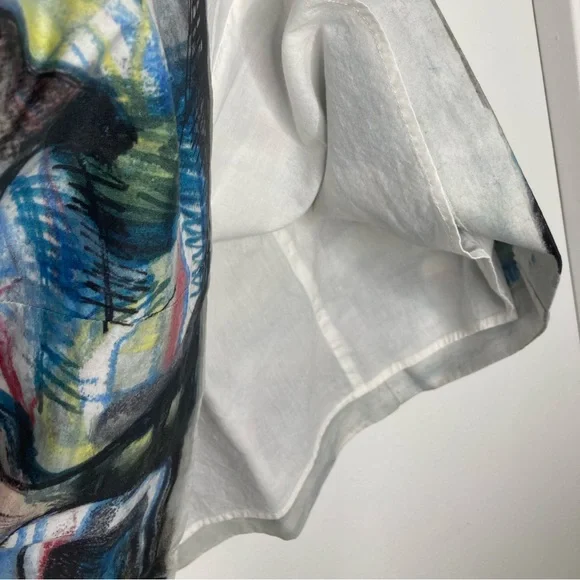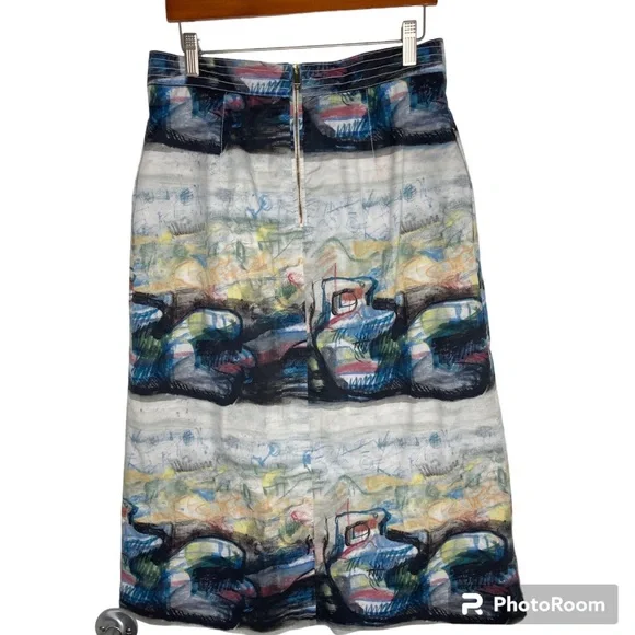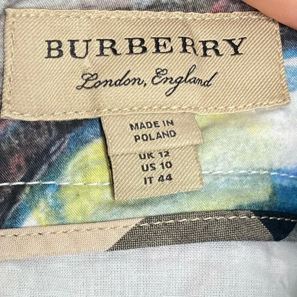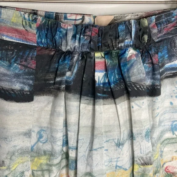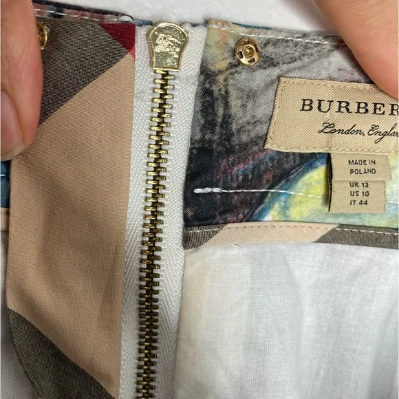 Burberry Reclining Figure: Bunched Print Cotton Poplin Skirt US 10 UK12 IT44.Excellent preowned condition, no stains, tears or other damage. From the 2017 collaboration with David Moore, limited edition. Flat waistband on sides and back, bunched/ruched in center front. Back zipper with plaid cover for zipper, fully lined, side pockets.Waist is 15" flat lay, 31" long.