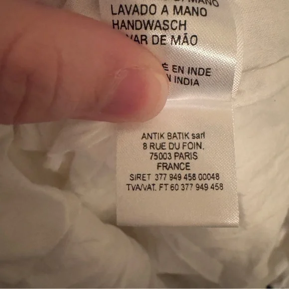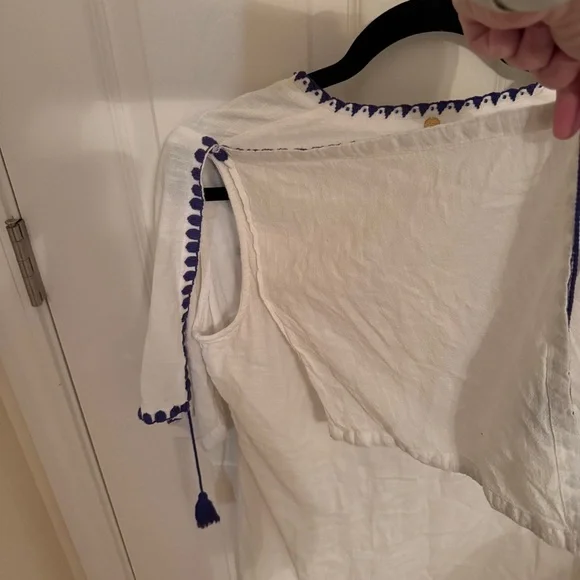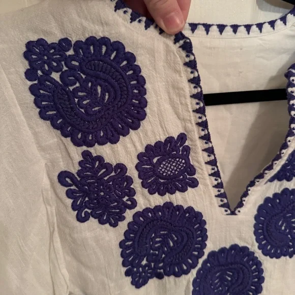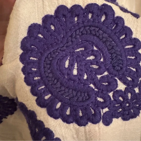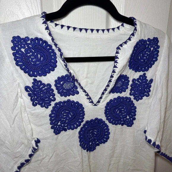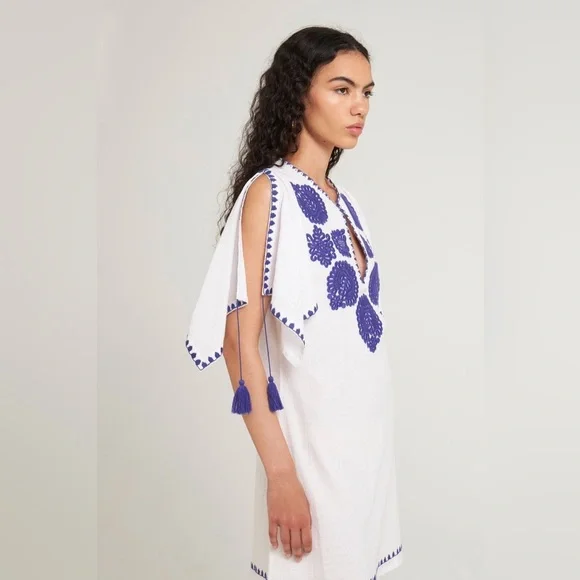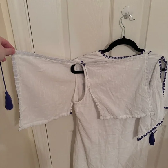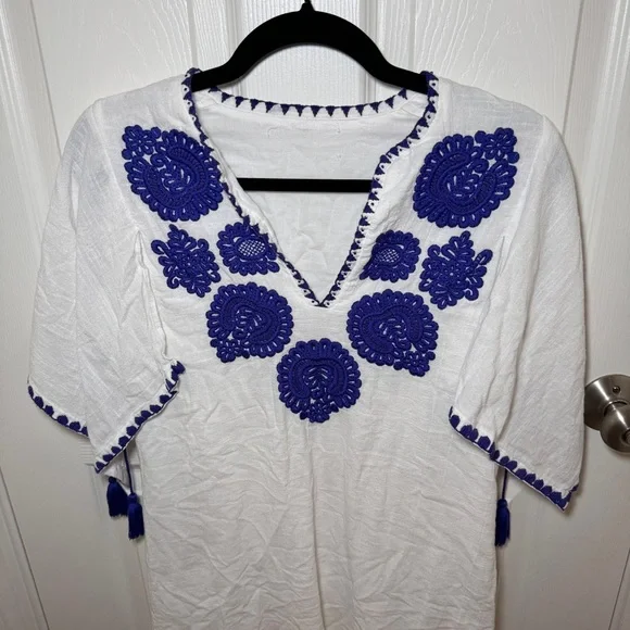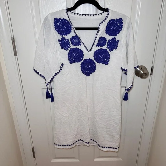 White cotton dress with royal blue embroidery and tassel detailing from Antik Batik. V-neck. SIZE: Unknown, fits like a small.MEASUREMENTSPit to pit: 19"Waist: 17"Length: 32.5"CONDITION: Pre-owned, good condition. No holes, rips, tears or stains. ABOUT MY CLOSET: Please feel free to send me an offer. I try to ship next day for all orders prior to 9:00pm EST. Have a great day :)