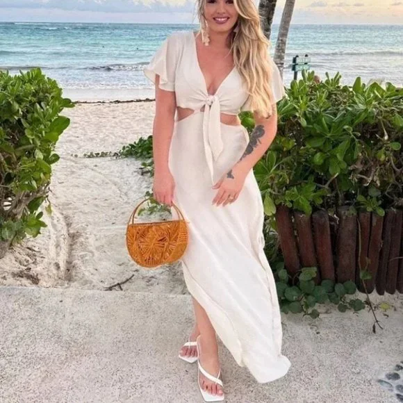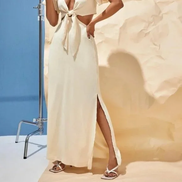 BEIGE TIE FRONT CUT OUT SPLIT HEM MAXI DRESS tags are lettersXS 0S 2/4M6L 8/10xl 12shipping time 6-10 DAYSSHOPPING SEARCHING ONLY: spring summer fall resort cruise beach coverup swim swimming pool side vegas aesthetic vibe retro vintage wedding guest engagement party bachelorette Christmas dress thanksgiving date night boho bridesmaid date night office work sexy modest festival contemporary layer classic trendy layered casual office preppy prom classy trendy work office business casual contemporary minimalist business formal dress gown prom ball dress professional hippie shabby chic trendy trending workplace wear fall winter spring summer 90s skirts skirt shorts shirts blazers dress pants blazer blouse tropical vacation coachella birthday gift present mini midi sexy hot holiday party vacation cruise travel western preppy tiktok classiC classy dresses top tops cardigans sweaters trendy work office business casual bohemian preppy girly trendy date night minimalist business professional workplace wear fall winter spring summer dress pants blazer ethereal Aurora Frill blouse holiday party modern contemporary modest church