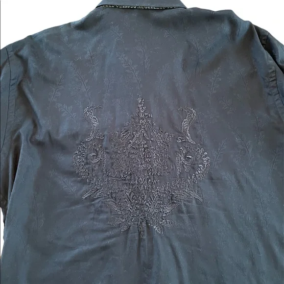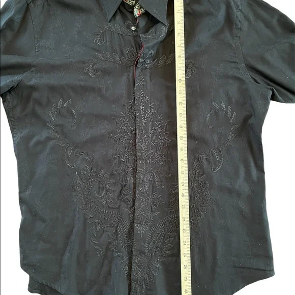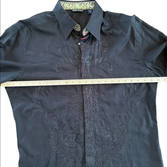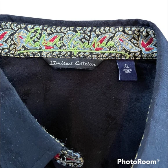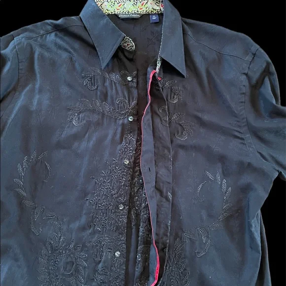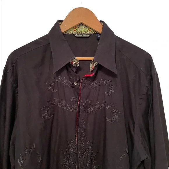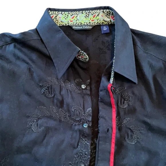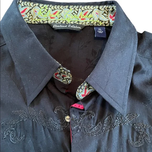 Robert Graham Limited Edition Embroidered Black Shirt - Size XLExcellent condition!(With my limited photography skills, the black color doesn’t appear as rich as it really is!)Limited Edition #302 of 640 made (see pics)Color - Black with black embroidery on front & back along with colorful embroidered cuffs.Measurements in pics (armpit to armpit- 24” / shoulder to hem - 30”)