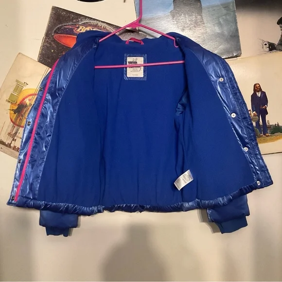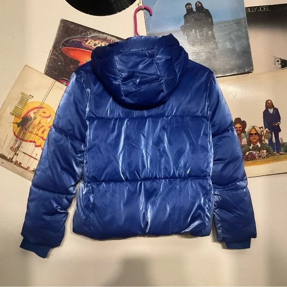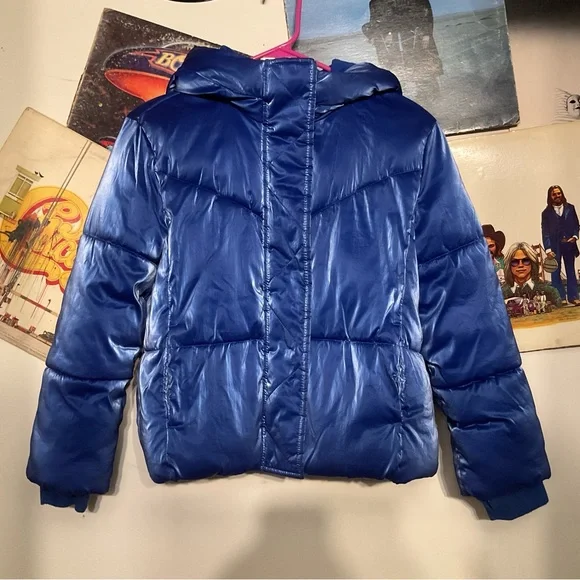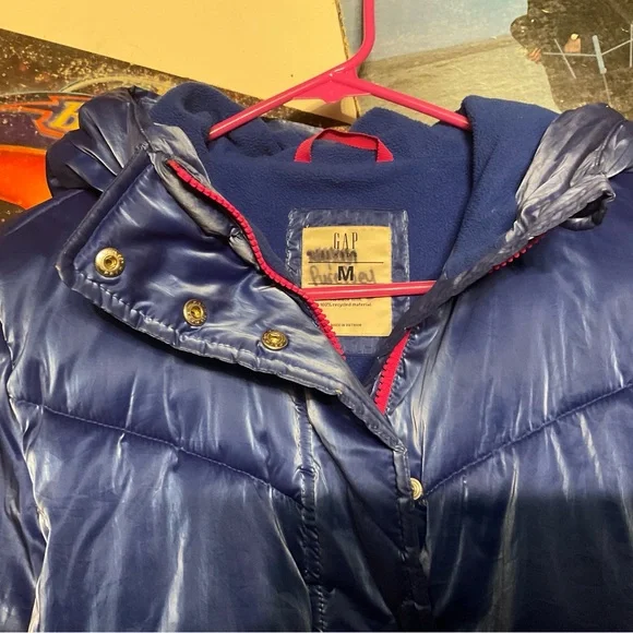 Soft, shiny, crinkled nylon, fleece lined puffer jacket.Hooded fleece lined neckline.Long sleeves with inner sleeve cuffs with thumb holes.Zipper front with snap close zipper flapFront slit side pockets.Warm polyfill.Made with 100% recycled nylon. Polyethylene coating provides water resistance lIn overall excellent condition with just light signs of wear. (Name written over label tag)