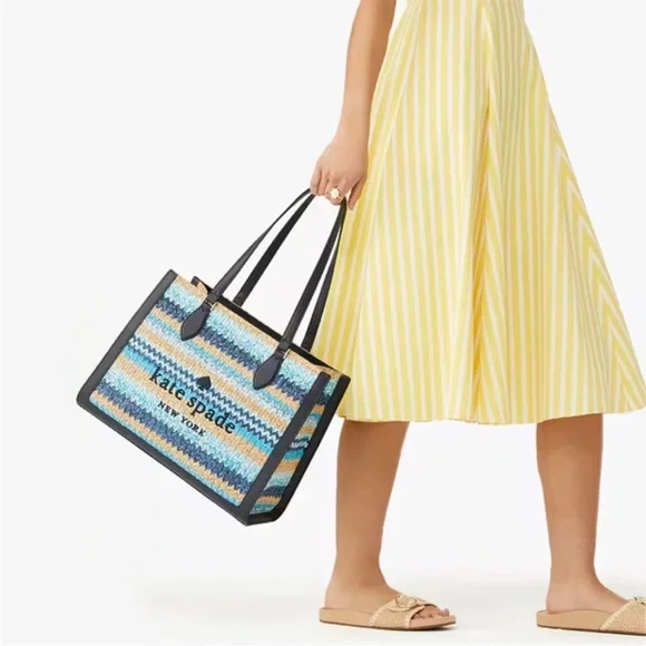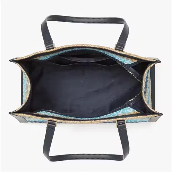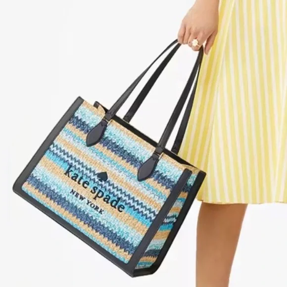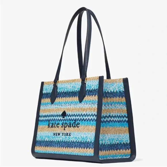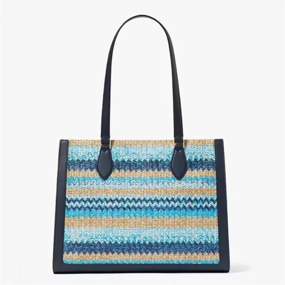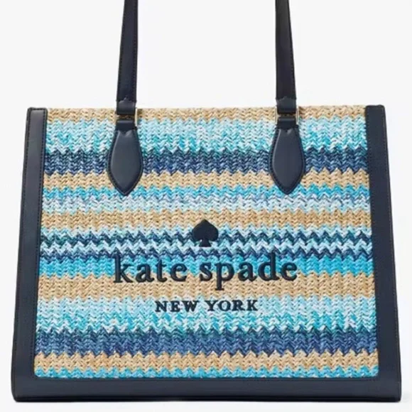 100% Authentic (Guaranteed!)Brand new with tagWoven Straw in Striped Pattern Embroidered Logo on Woven Straw Navy Blue Smooth Leather Trim Drop in top zip closure Interior zip and slip pockets Signature Two Way Script Logo Jacquard Lining Metal Protective Feet Bottom Shoulder Length Handle Drop: 11.0" Large Size: 11.72" H x 6.68" D x 15.08"W (Bottom), 14.8"W (Top) Color: Blue Multi (403) BLM MSRP $459 plus tax Style number KG601Bundle to Save Check out many other bags totes satchels backpacks weekenders wallets wristlets crossbody purses cosmetic cases iPhone cases earrings necklaces rings beach towels bath hand towels washcloths towel sets shoes boots booties lace up slip on slippers socks sandals shorts pants tights leggings pjs joggers loungers tees tanks blouses pillows mats rugs jackets windbreakers swimsuits goggles hats throw blankets comforters sports bras underwear briefs bikinis sleepwear sleep shorts shirts in my Closet. Thanks!