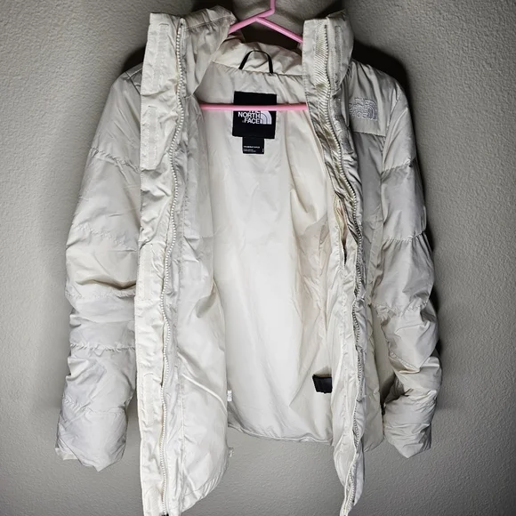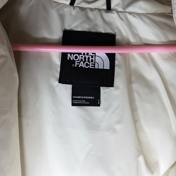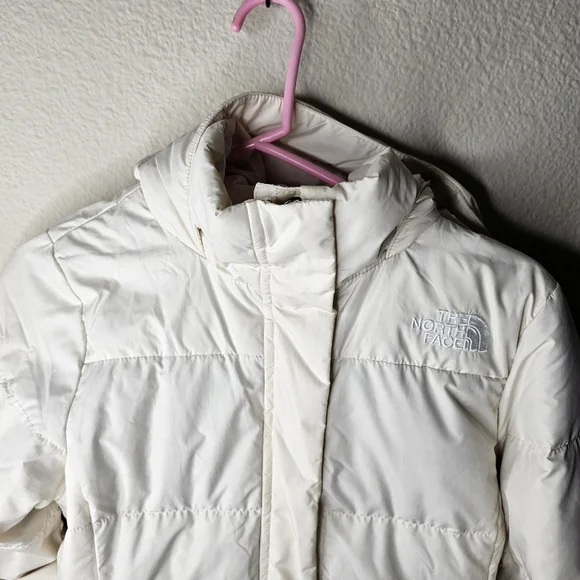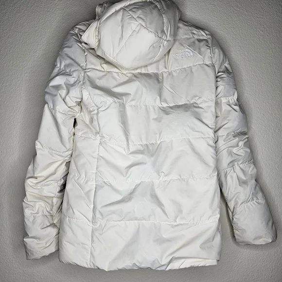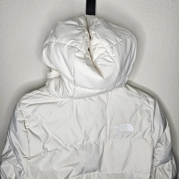 BRAND - The North FaceCOLOR - Ivory STYLE - Down Puffer SIZE (estimations)- Small/PetiteFEATURES - Full Zip / Adjustable Elastic bands on hood + Waist / HoodCONDITION - Like New, lighly worn.Some wear on front logo (see pic) Non-PFC durable water repellent (DWR) finish helps moisture bead up on the surface600-fill-power goose down in large baffles helps keep you warmAttached, 3-piece hood offers insulated warmthExposed VISLON® zipper on center frontElasticated cuffs and hemExposed, secure-zip hand pocketsEmbroidered logo on left chest and back-right shoulderStandard fit