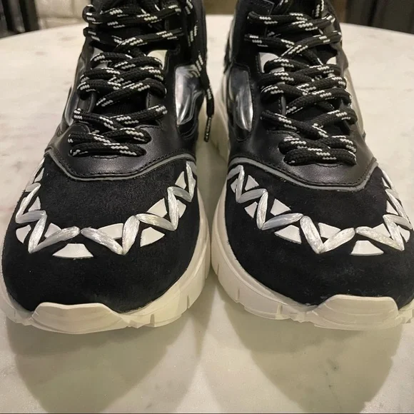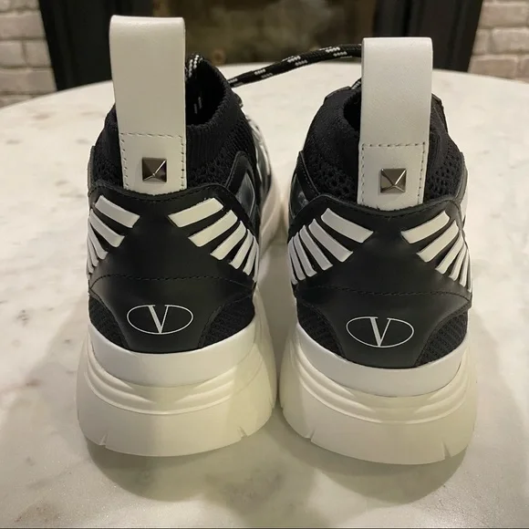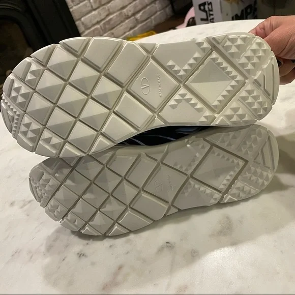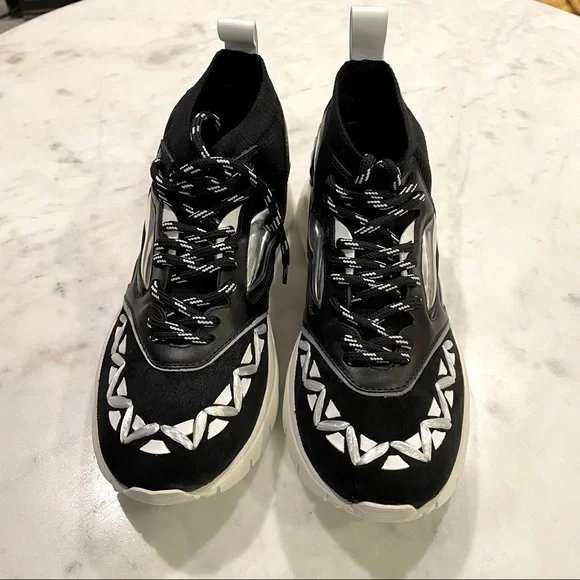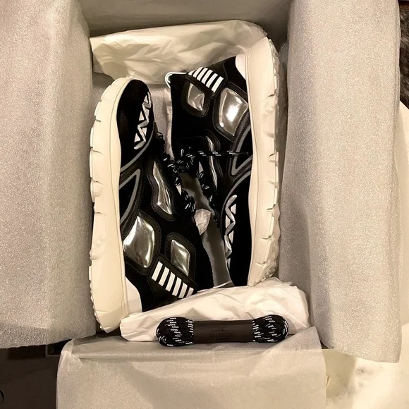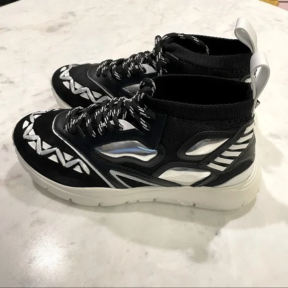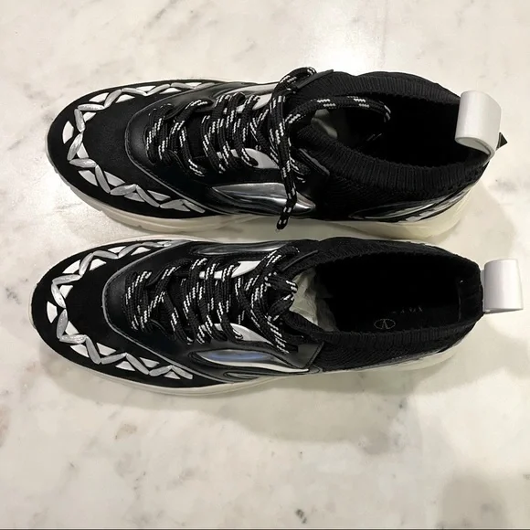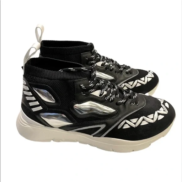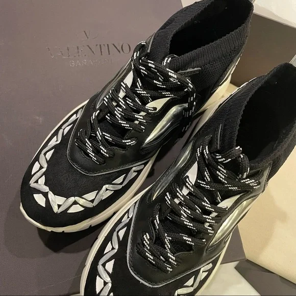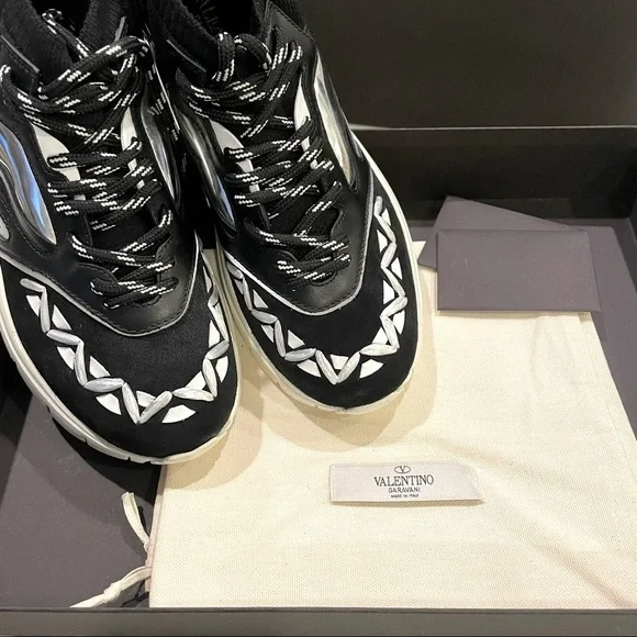 New with box and dust bag, Heroes women’s sneakers by Valentino. Size 40 EU or 9 US. Ankle height, extra set of shoelaces included. Black/ White combo with silver details. Authentic, purchased from high end store.Woven details add texture to on-trend sock sneakers * Polyester/polyamide upper * Suede trim * Padded insole * Rubber sole * Made in Italy