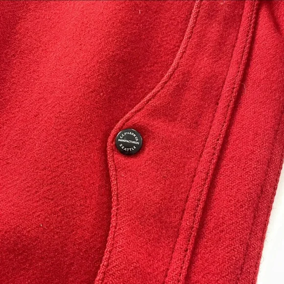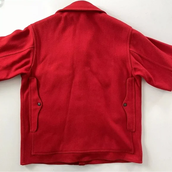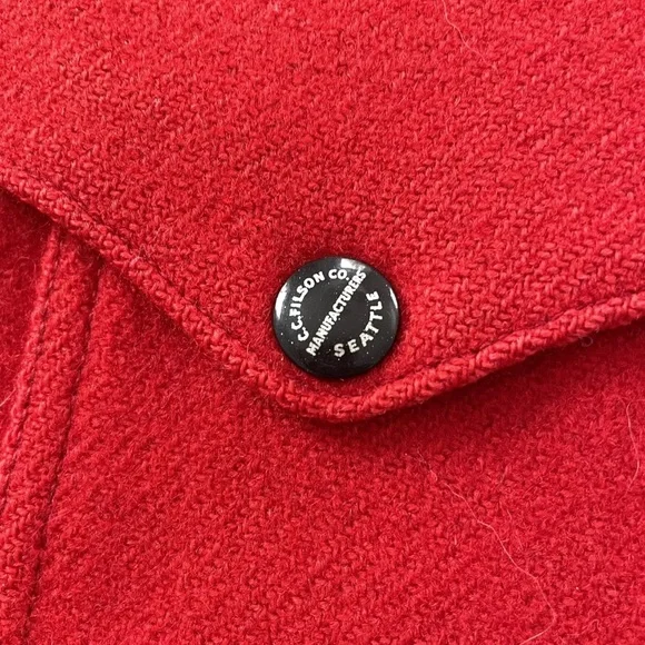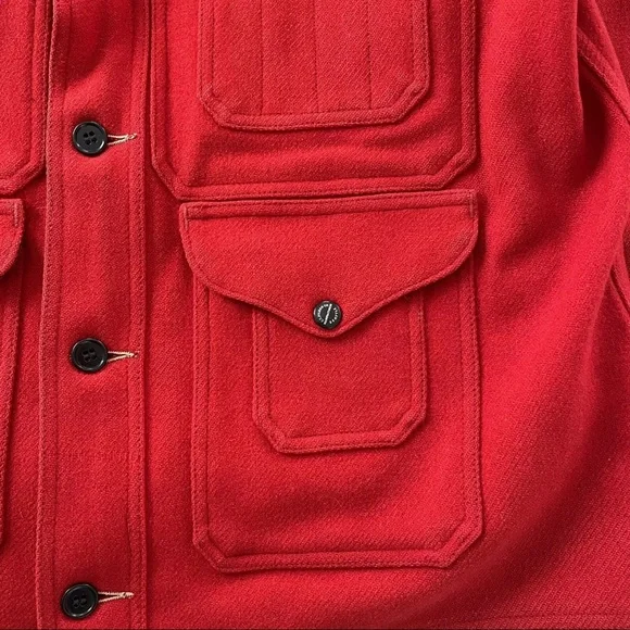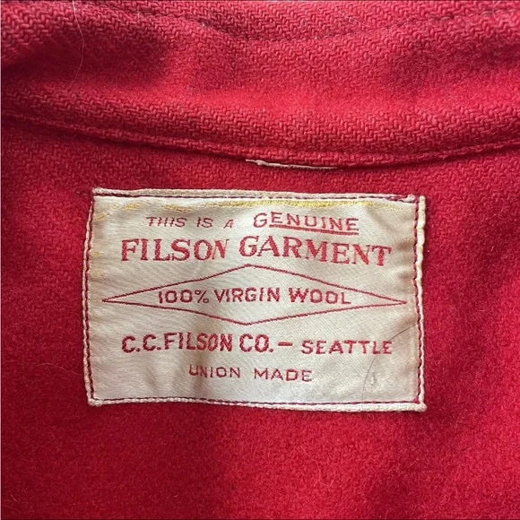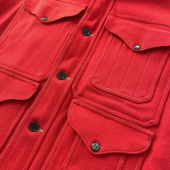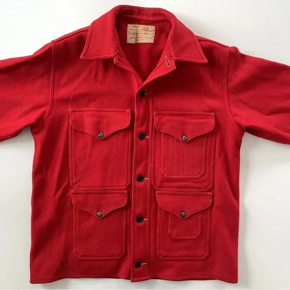 1950s FILSON CRUISER MACKINAW JACKET Scarlet Red Hunting Wool Vtg TOP QUALITY.If you’re looking for the best vintage Filson Cuiser you can find, this one is it. This is a 50s Union Made Era Cruiser in the hard to find solid red colorway. It has perfect condition black enameled snaps, the Union made main tag, and the Union tag sewn inside the chest pocket. The wool is flawless showing no wear, or damage.The only issue is that it is missing it’s paper size tag. Based on the measurements, it is a size 44 jacket.Dimensions:Chest (pit to pit) - 24”Length - 29”Please refer to pictures for complete condition details.* Actual item being sold shown in pictures.* Any major flaws that the item might have will be pointed out in the pictures.* Carefully packaged, ships within 2 business days.Please shoot me any questions on the item prior to purchase. Thank you!