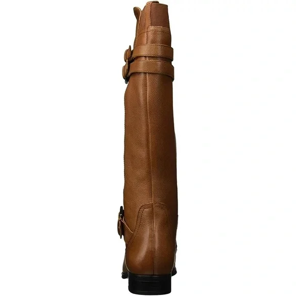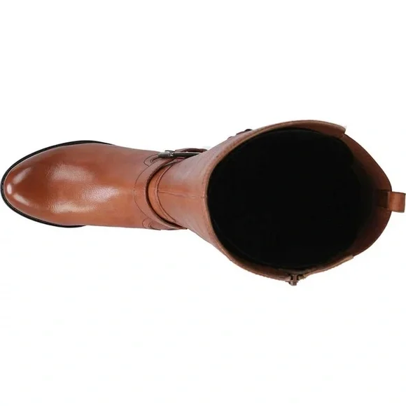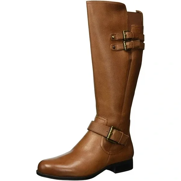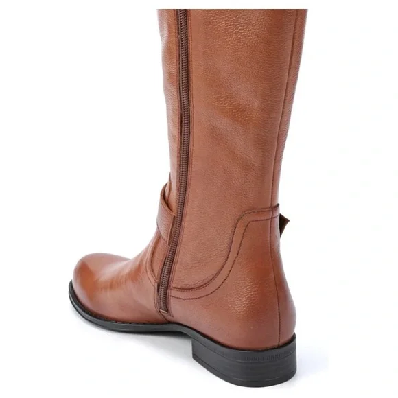 The Jessie riding boot from Naturalizer is versatile enough to pair with any outfit. A smooth leather construction is finished with sleek buckle accent for your new favorite knee high. Inside zipper for easy-on-easy-off. And a round Toe Box for a relaxed fit.Heel Height (approximately): 1" stacked block heel.Shaft Height (approximately): 14-1/2"Calf Circumference (approximately): 14-1/4"Color cognac brownNew with Tags in original box Box may show signs of shelf wearSize 6.5 Wide calf