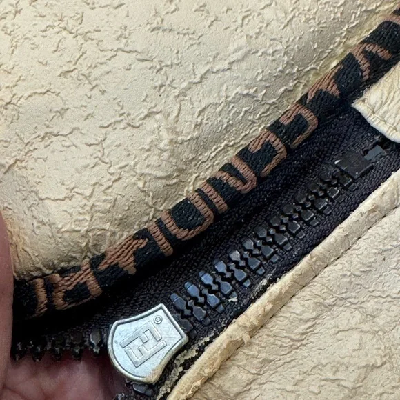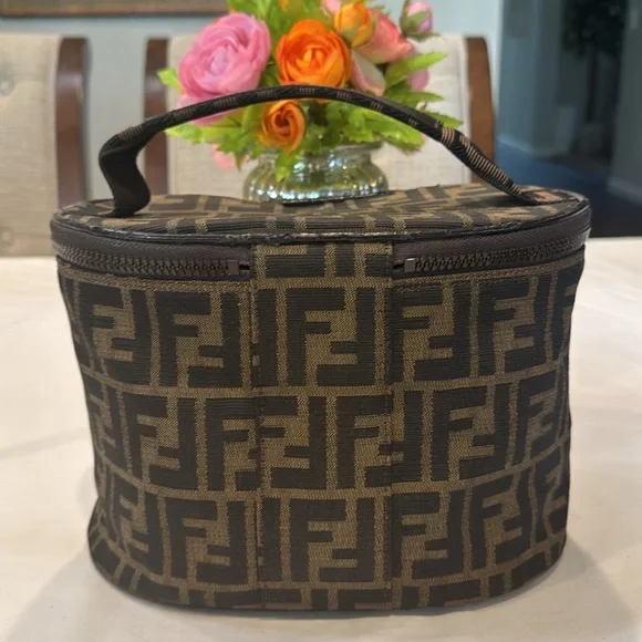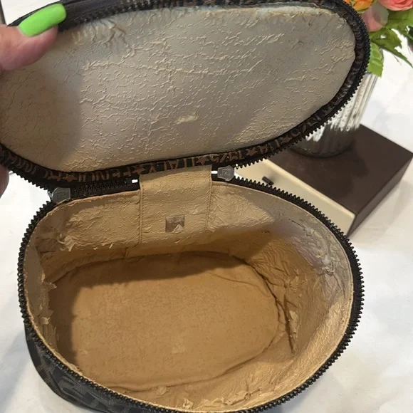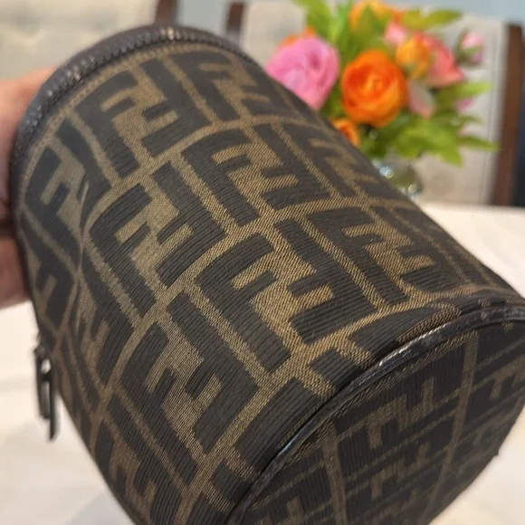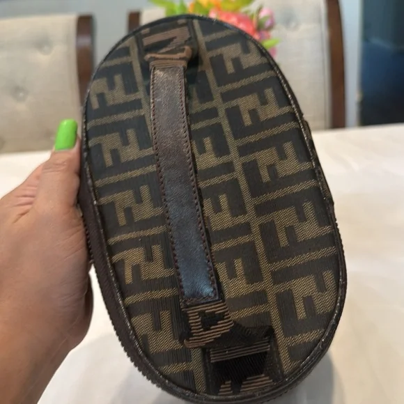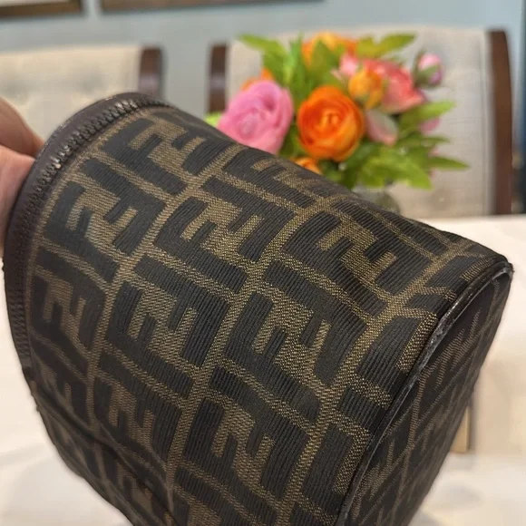 This Fendi toiletry bag showcases the brand's signature FF monogram in a sophisticated brown hue. Its structured design and zip-around closure make it ideal for organizing your essentials with style. The luxurious aesthetic and practical size make it a must-have accessory for any travel occasion. It has the typical rubs on the edges, some white stains on canvas and stickiness inside that can be removed but still has a life left. PRICE IA FIRM!!!