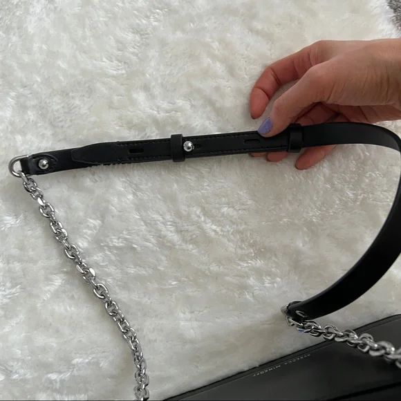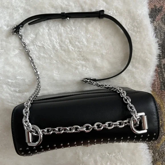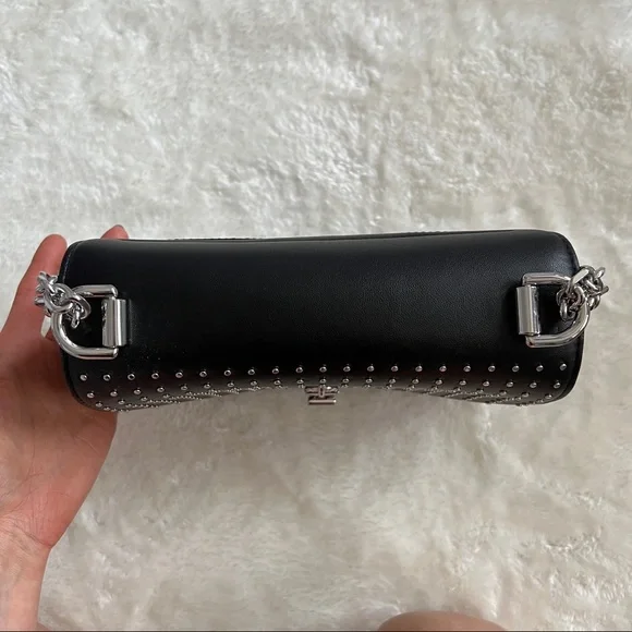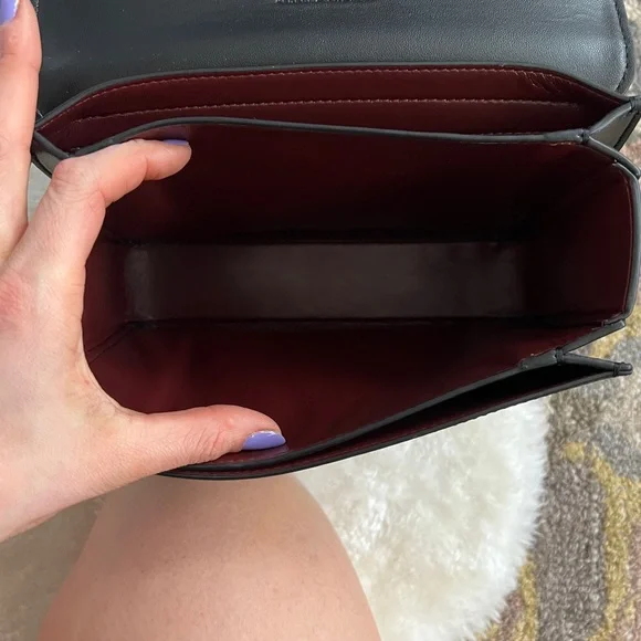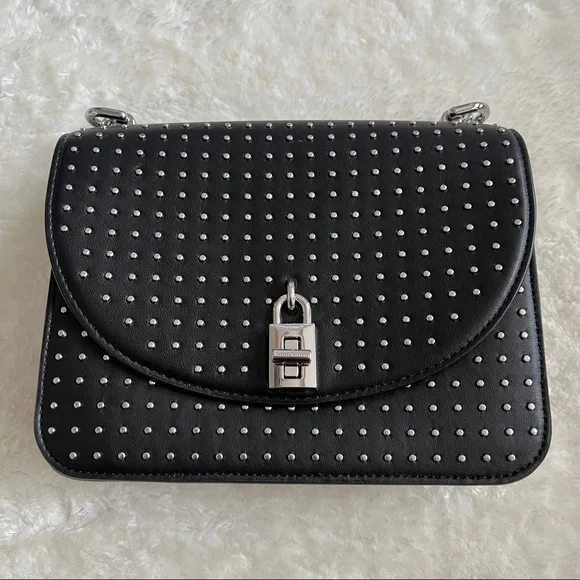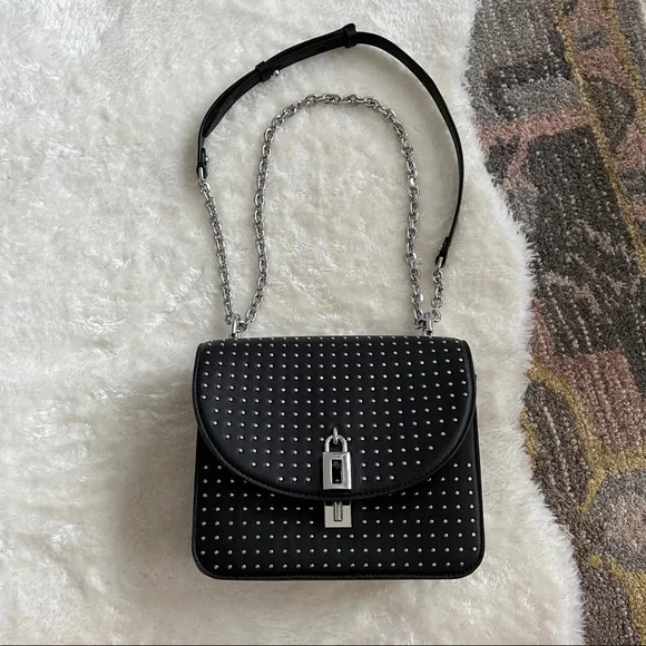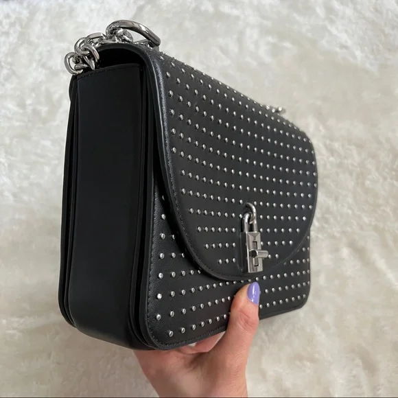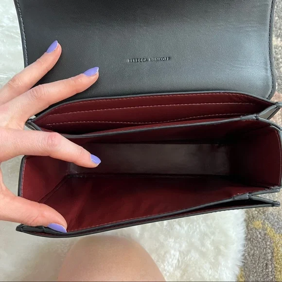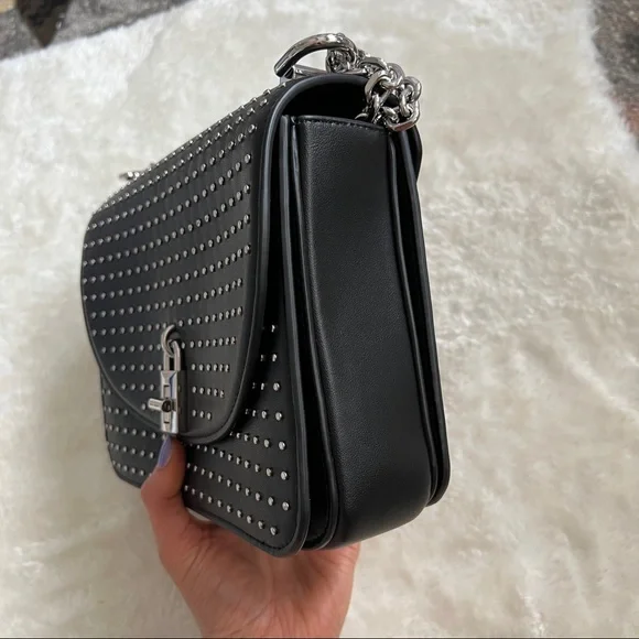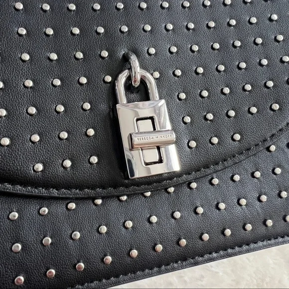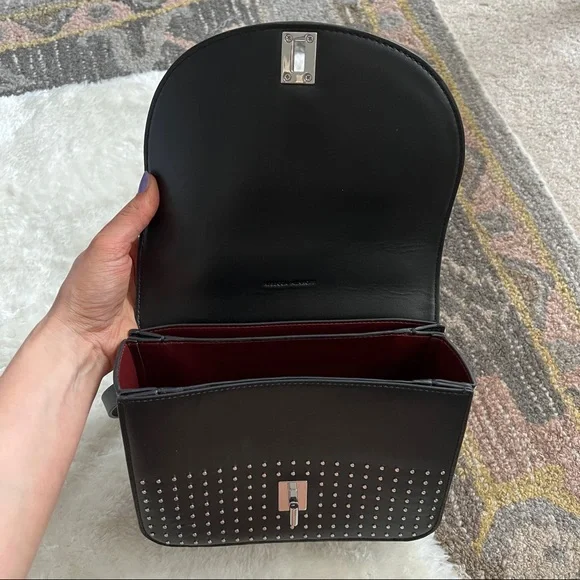 Rebecca Minkoff Love Too Black Studded CrossbodyBlack leather Silver studs & hardware Maroon/red inside Flap closure with claspOne bigger interior compartment with two tbh in compartments on either side. Back pocket on exterior panel. Measurements are approx 8 wide x 6 long x 2 deep (when the outer pockets aren’t filled. When filled it can expand to hold more). Worn once for a couple of hours for an event, perfect condition. Will send with original dust bag @ care card. I purchased it directly from the retailer’s website.