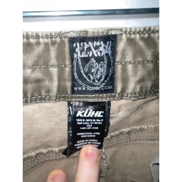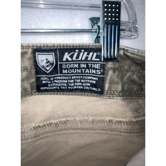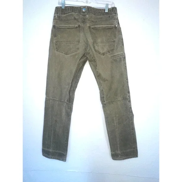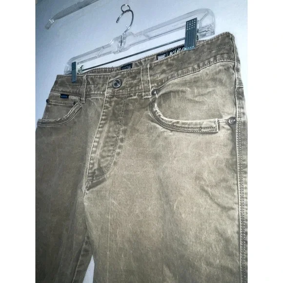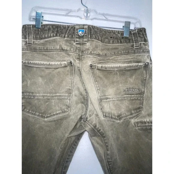 The Kuhl Rydr Jeans in men's size 32x34 are a stylish and rugged choice for outdoor enthusiasts. Featuring a vintage patina dye, these brown denim pants offer a regular fit with a straight leg style. Made with quality fabric, these jeans are designed to be durable and comfortable for any adventure. The Kuhl brand is known for its outdoor-inspired clothing, and these pants live up to that reputation with their nature theme and convenient pockets for storage. Perfect for any man looking for a versatile and reliable pair of jeans.These are in excellent pre-owned condition.