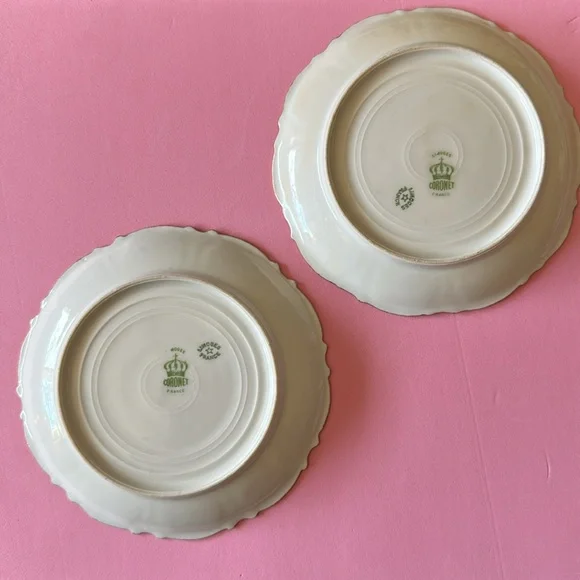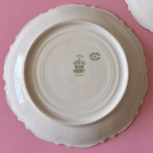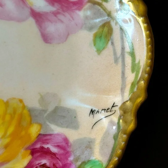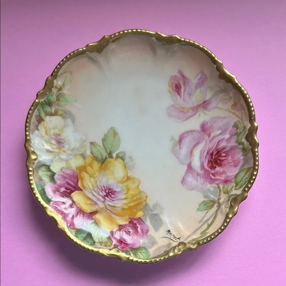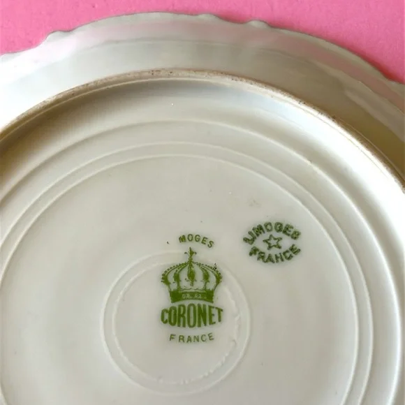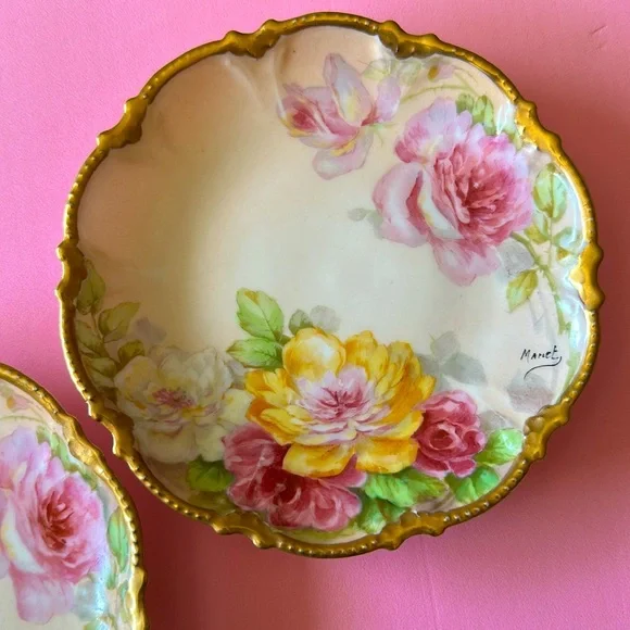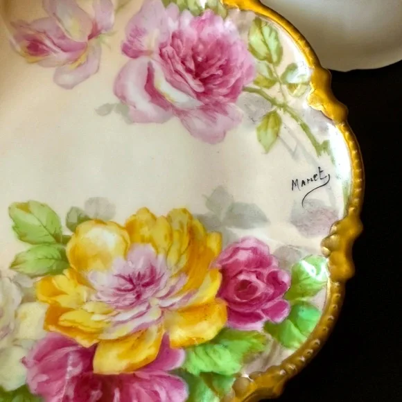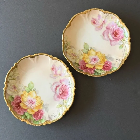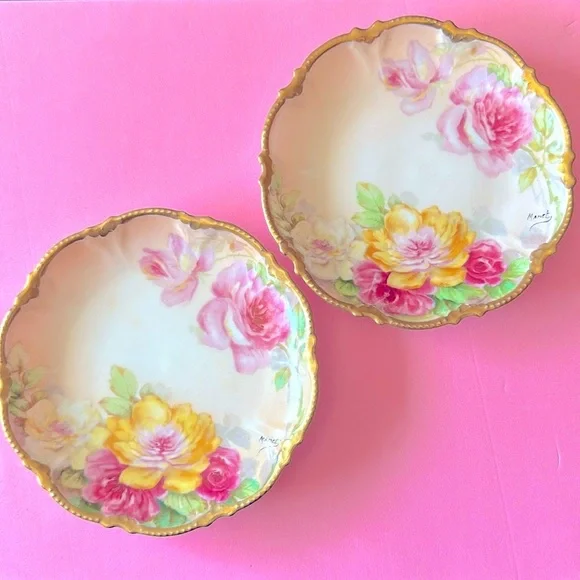 These exquisite plates feature the George Borgfeldt mark “Coronet” from France. The art studio was in Paris and the porcelain china was made in Limoges. ( Borgfeldt Mark 1 & Mavaleiux Mark).~ The Coronet importer / decorator mark in green with a crown was used 1906-1920. ( Borgfeldt Mark 1). ~ A BEAUTIFUL set of 2 plates, featuring yellow, pink, and white roses with green leaves on a pale yellow background. ~ Scalloped , heavily gilt edges ~ Both are artist signed “Manet”~ Absolutely stunning pieces in outstanding antique condition!**NO: Chips, cracks, repairs or color loss. ~ From my private collection/ family estate 🌸 Smoke-free home