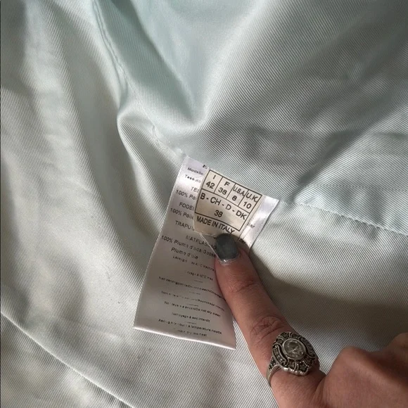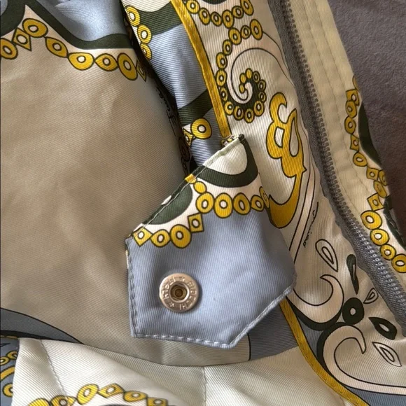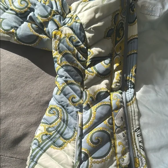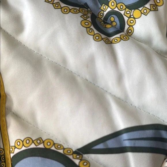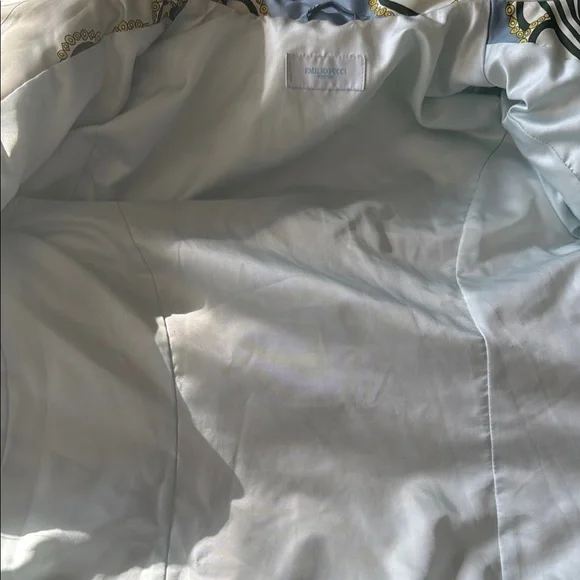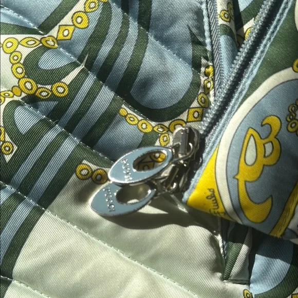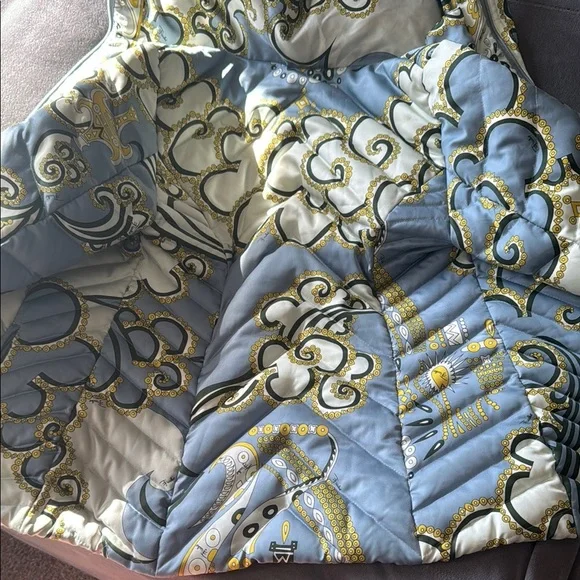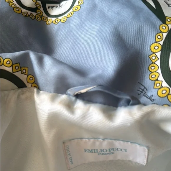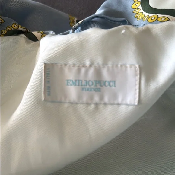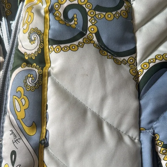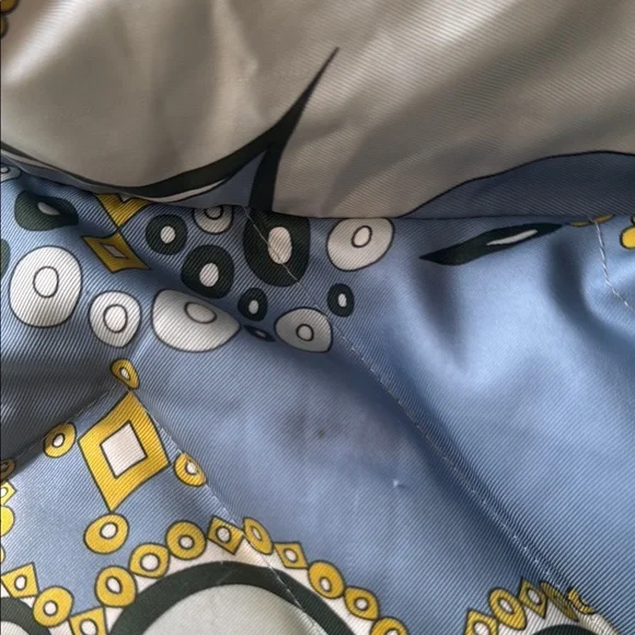 Lux vintage style with this chic women's quilted jacket. Featuring a stunning blue and cream design, this jacket is perfect for any occasion. Stay warm and fashionable. Front zipper pockets, both clean and free of debris stuffed with feather down as interior 100% polyester with the goose down as the filler. A few spots of where noted by the neck and a few very small spots on the quilting as pictured one very small spot in the back but overall in great, pre owned, used condition marked as a size 8. Double zip as well with the PUCCI logo- both in great shape. I bought this from the live show of maidenLane, love everything about this jacket. It just is too big for me. A medium would probably work best. This will go to posh verifications for authenticity if sold over the 300 mark- just so you are aware 300+ gets sent to them. Luxury jacket puffer Pucci cozy winter double zip paisley warm