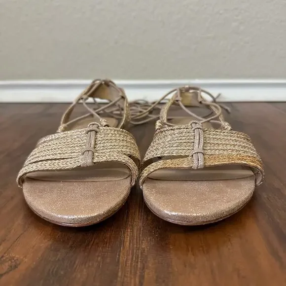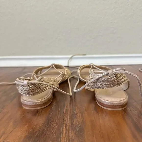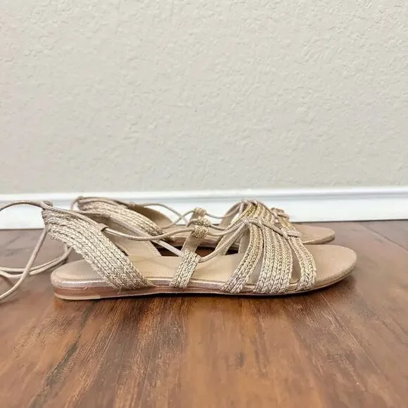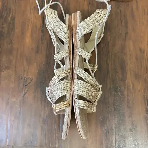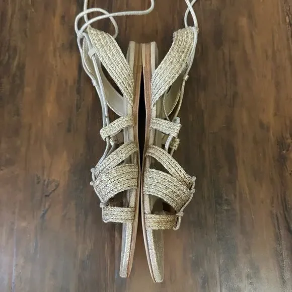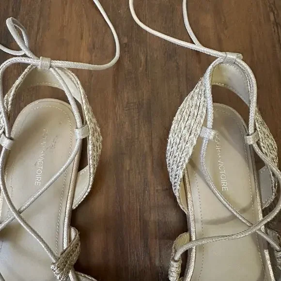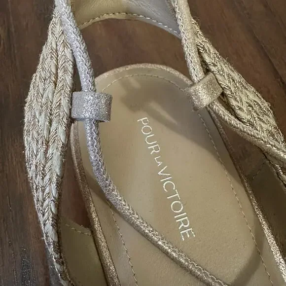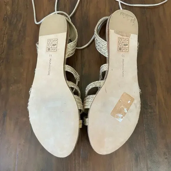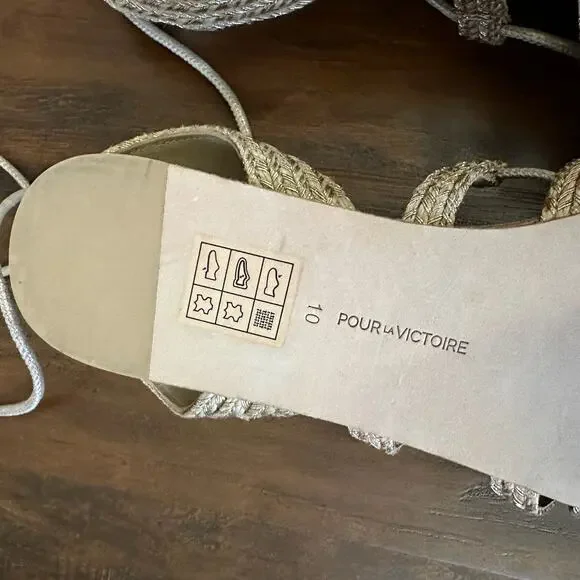POUR LA VICTOIRE Lora Sandals Womens Sz 10 Beige Gold Metallic Raffia GladiatorNew without box! Never worn! See all pictures for detail.Step into effortless style with the POUR LA VICTOIRE Lora Sandals, a chic addition to any wardrobe. Crafted with a playful beige and gold metallic raffia upper, these gladiator-inspired sandals offer an adjustable fit thanks to their lace-up closure, ensuring comfort and security with every step. The lightweight design, coupled with a breathable leather insole and lining, makes these sandals a perfect choice for various occasions, from casual outings to travel adventures. The flat heel maintains a low profile, making them an ideal companion for those who value both fashion and function.RaffiaLeatherLace UpGladiatorFlatsOpen ToeAdjustableComfortSummerBohemianFestivalBeach
